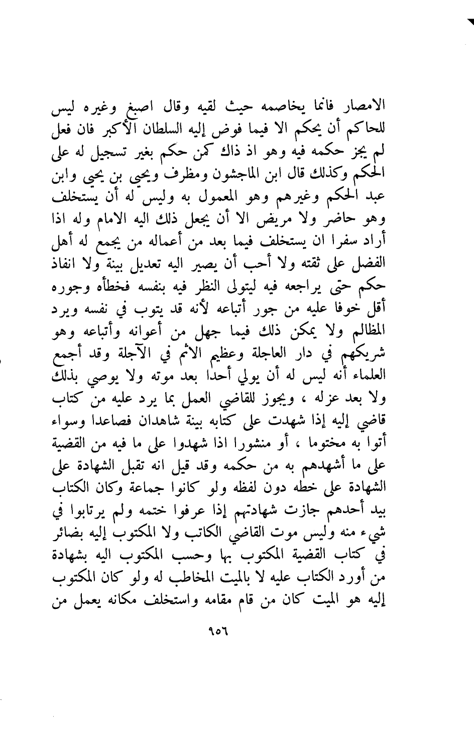 الأمصار فإنما يخاصمه حيث لقيه وقال أصبغ وغيره ليس للحاكم أن يحكم إلا فيما فوض إليه السلطان الأكبر فإن فعل لم يجز حكمه فيه وهو إذ ذاك كمن حكم بغير تسجيل له على الحكم وكذلك قال ابن الماجشون ومظرف ويحيى بن يحيى وابن عبد الحكم وغيرهم وهو المعمول به وليس له أن يستخلف وهو حاضر ولا مريض إلا أن يجعل ذلك إليه الإمام وله إذا أراد سفرا أن يستخلف فيما بعد من أعماله من يجمع له أهل الفضل على ثقته ولا أحب أن يصير إليه تعديل بينة ولا إنفاذ حكم حتى يراجعه فيه ليتولى النظر فيه بنفسه فخطأه وجوره أقل خوفا عليه من جور أتباعه لأنه قد يتوب في نفسه ويرد المظالم ولا يمكن ذلك فيما جهل من أعوانه وأتباعه وهو شريكهم في دار العاجلة وعظيم الإثم في الآجلة وقد أجمع العلماء أنه ليس له أن يولي أحدا بعد موته ولا يوصي بذلك ولا بعد عزله ويجوز للقاضي العمل بما يرد عليه من كتاب قاضي إليه إذا شهدت على كتابه بينة شاهدان فصاعدا وسواء أتوا به مختوما أو منشورا إذا شهدوا على ما فيه من القضيه على ما اشهدهم به من حكمه وقد قيل انه تقبل الشهاده على الشهاده على خطه دون لفظه ولو كانوا جماعة وكان الكتاب بيد احدهم جازت شهادتهم اذا عرفوا ختمه ولم يرتابوا في شيء منه وليس موت القاضي الكاتب ولا المكتوب اليه بضائر في كتاب القضية المكتوب بها وحسب المكتوب اليه بشهادة من أورد الكتاب عليه لا بالميت المخاطب له ولو كان المكتوب اليه هو الميت كان من قام مقامه واستخلف مكانه يعمل من