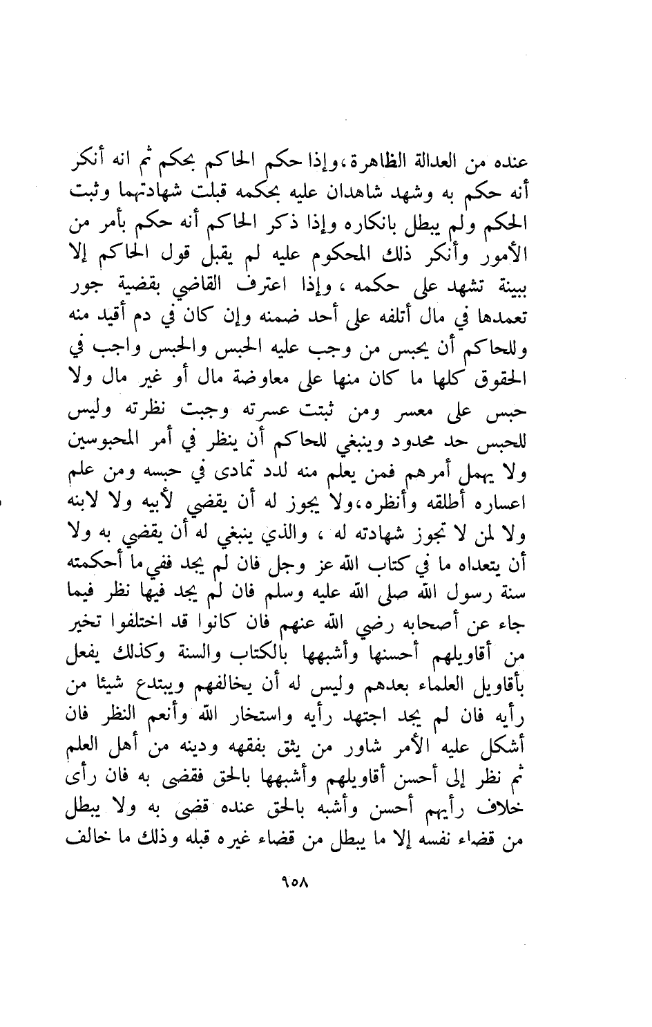 عنده من العداله الظاهره واذا حكم الحاكم بحكم ثم انكر أنه حكم به وشهد شاهدان عليه بحكمه قبلت شهادتهما وثبت الحكم ولم يبطل بإنكاره واذا ذكر الحاكم أنه حكم بأمر من الامور وأنكر ذلك المحكوم عليه لم يقبل قول الحاكم الا ببينة تشهد على حكمه واذا اعترف القاضي بقضية جور تعمدها في مال اتلفه على أحد ضمنه وإن كان في دم افيد منه وللحاكم أن يحبس من وجب عليه الحبس والحبس واجب في الحقوق كلها ما كان منها على معاوضة مال أو غير مال ولا حبس على معسر ومن ثبتت عسرته وجبت نظرته وليس للحبس حد محدود وينبغي للحاكم أن ينظر في امر المحبوسين ولا يهمل أمرهم فمن يعلم منه لدد تمادى في حبسه ومن علم إعساره أطلقه وأنظره ولا يجوز له أن يقضي لأبيه ولا لابنه ولا لمن لا تجوز شهادته له والذي ينبغي له أن يقضي به ولا أن يتعداه ما في كتاب الله عز وجل فإن لم يجد ففي ما أحكمته سنة رسول الله صلى الله عليه وسلم فإن لم يجد ففي ما أحكمته سنة رسول الله صلى الله عليه وسلم فإن لم يجد فيها نظر فيما جاء عن اصحابه رضي الله عنهم فإن كانوا قد اختلفوا تخير من اقاويلهم أحسنها وأشبهها بالكتاب والسنة وكذلك يفعل بأقاويل العلماء بعدهم وليس له أن يخالفهم ويبتدع شيئا من رأيه فإن لم يجد اجتهد رأيه واستخارالله وأنعم النظر فإن أشكل عليه الامر شاور من يثق بفقهه ودينه من اهل العلم ثم نظر الى احسن اقاويلهم وأشبهها بالحق فقضى به فإن رأى خلاف رأيهم أحسن وأشبه بالحق عنده قضى به ولا يبطل من قضاء نفسه الا ما يبطل من قضاء غيره قبله وذلك ما خالف