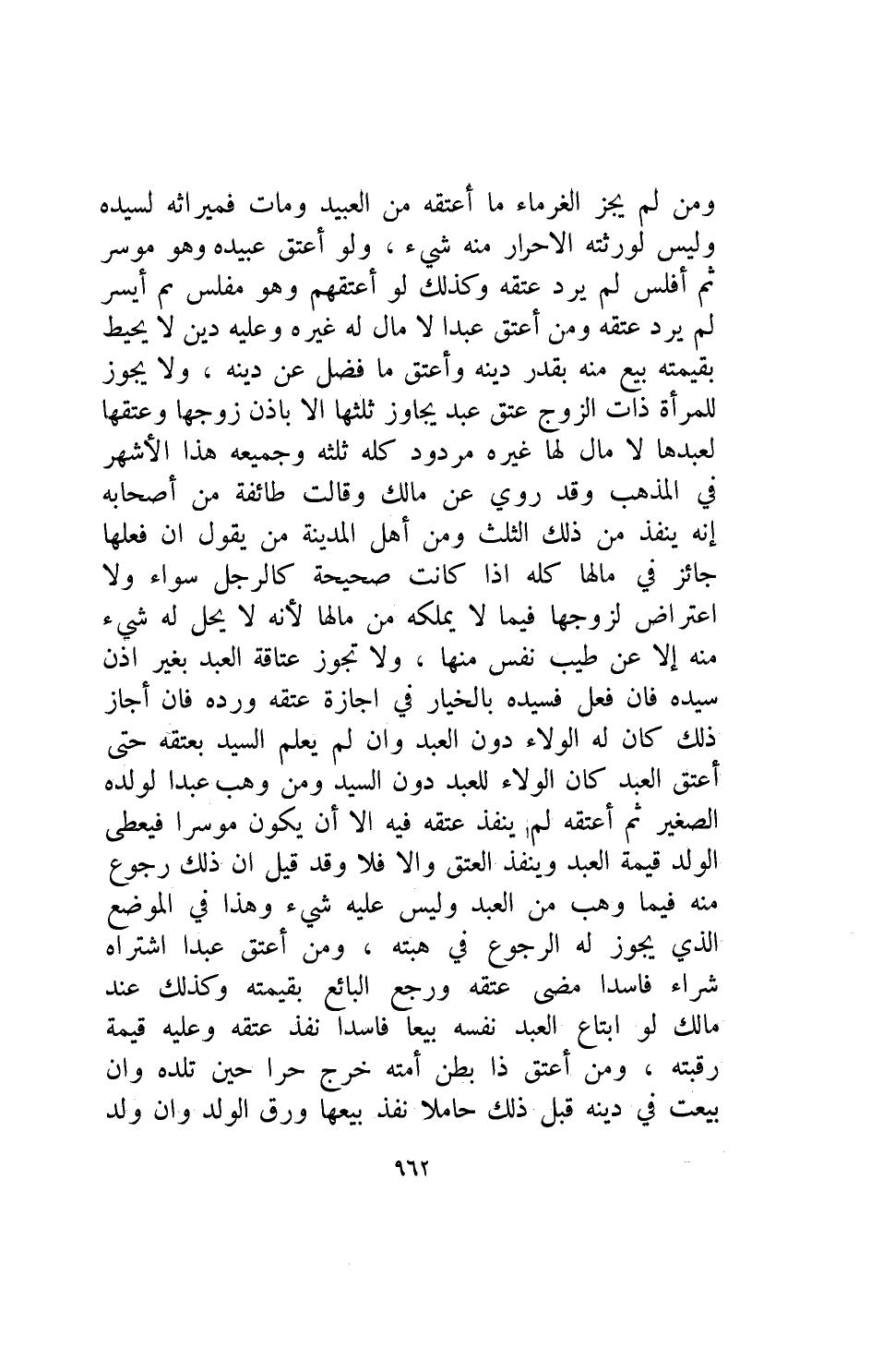 ومن لم يجز الغرماء ما اعتقه من العبيد ومات فميراثه لسيده وليس لورثته الاحرار منه شيء ولو اعتق عبيده وهو موسر ثم افلس لم يرد عتقه وكذلك لو اعتقهم وهو مفلس ثم أيسر لم يرد عتقه ومن اعتق عبدا لا مال له غيره وعليه دين لا يحيط بقيمته بيع منه بقدر دينه وأعتق ما فضل عن دينه ولا يجوز للمرأة ذات الزوج عتق عبد يجاوز ثلثها إلا بإذن زوجها وعتقها لعبدها لا مال لها غيره مردود كله ثلثه وجميعه هذا الاشهر في المذهب وقد روي عن مالك وقالت طائفة من اصحابه إنه ينفذ من ذلك الثلث ومن أهل المدينه من يقول إن فعلها جائز في مالها كله اذا كانت صحيحه كالرجل سواء ولا اعتراض لزوجها فيما لا يملكه من مالها لانه لايحل له شيء منه الا عن طيب نفس منها ولا تجوز عتاقة العبد بغير اذن سيده فإن فعل فسيده بالخيار في إجازة عتقه ورده فإن أجاز ذلك كان له الولاء دون العبد وأن لم يعلم السيد بعتقه حتى اعتق العبد كان الولاء للعبد دون السيد ومن وهب عبدا لولده الصغير ثم أعتقه لم ينفذ عتقه فيه الا ان يكون موسرا فيعطى الولد قيمة العبد وينفذ العتق وإلا فلا وقد قيل إن ذلك رجوع منه فيما وهب من العبد وليس عليه شيء وهذا في الموضع الذي يجوز له الرجوع في هبته ومن اعتق عبدا اشتراه شراء فاسدا مضى عتقه ورجع البائع بقيمته وكذلك عند مالك لو ابتاع العبد نفسه بيعا فاسدا نفذ عتقه وعليه قيمة رقبته ومن أعتق ذا بطن أمته خرج حرا حين تلده إن بيعت في دينه قبل ذلك حاملا نفذ بيعها ورق الولد وإن ولد