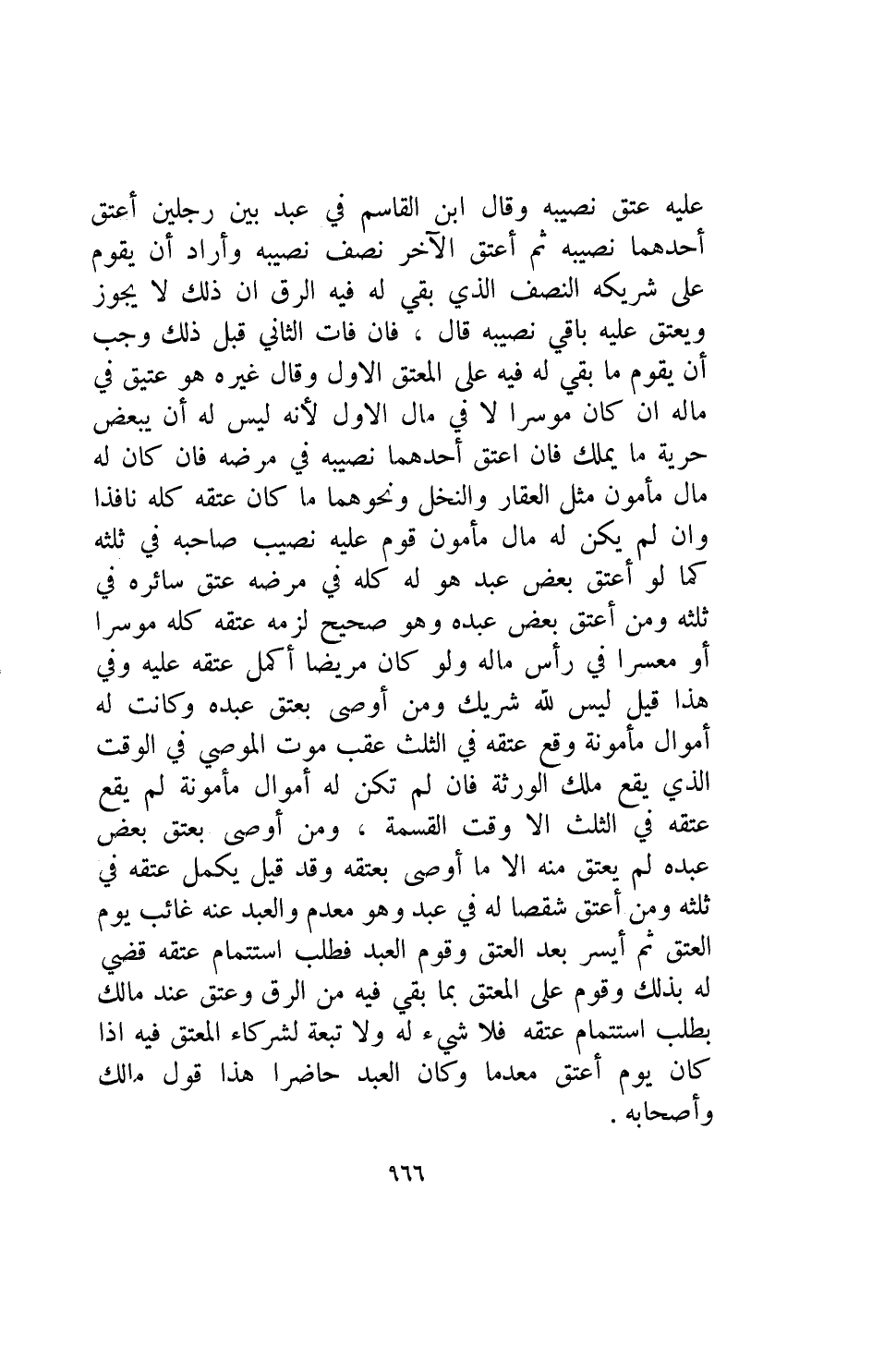 عليه عتق نصيبه وقال ابن القاسم في عبد بين رجلين أعتق احدهما نصيبه ثم أعتق الآخر نصف نصيبه وأراد أن يقوم على شريكه النصف الذي بقي له فيه الرق ان ذلك لايجوز ويعتق عليه باقي نصيبه قال فإن فات الثاني قبل ذلك وجب أن يقوم ما بقي له فيه على المعتق الأول وقال غيره هو عتيق في ماله إن كان موسرا لا في مال الأول لأنه ليس له أن يبعض حرية ما يملك فإن أعتق أحدهما نصيبه في مرضه فإن كان له مال مأمون مثل العقار والنخل ونحوهما ما كان عتقه كله نافذا وإن لم يكن له مال مأمون قوم عليه نصيب صاحبه في ثلثه كما لو أعتق بعض عبده وهوصحيح لزمه عتقه كله موسرا أو معسرا في رأس ماله ولو كان مريضا أكمل عتقه عليه وفي هذا قيل ليس لله شريك ومن اوصى بعتق عبده وكانت له اموال مأمونه وقع عتقه في الثلث عقب موت الموصي في الوقت الذي يقع ملك الورثه فإن لم تكن أموال مأمونه لم يقع عتقه في الثلث إلا وقت القسمة ومن أوصى بعتق بعض عبده لم يعتق منه إلا ما أوصى بعتقه وقد قيل يكمل عتقه في ثلثه ومن اعتق شخصا له في عبد وهو معدم والعبد عنه غائب يوم العتق ثم أيسر بعد العتق وقوم العبد فطلب استتمام عتقه قضى له بذلك وقوم على المعتق بما بقي فيه من الرق وعتق عند مالك بطلب استتمام عتقه فلا شيء له ولا تبعه لشركاء المعتق فيه اذا كان يوم أعتق معدما وكان العبد حاضرا هذا قول مالك واصحابه