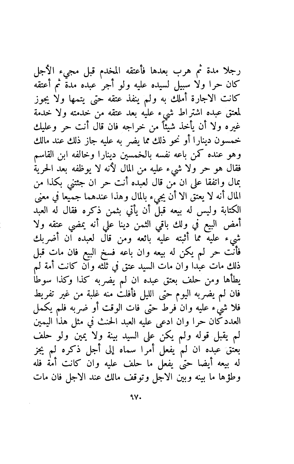 رجلا مدة ثم هرب بعدها فأعتقه المخدم قبل مجيء الاجل كان حرا ولا سبيل لسيده عليه ولو أجر عبده مدة ثم اعتقه كانت الاجارة أملك به ولم ينفذ عتقه حتى يتمها ولا يجوز لمعتق عبده اشتراط شيء عليه بعد عتقه من خدمته ولا خدمة غيره ولا ان يأخذ شيئا من خراجه فإن قال أنت حر وعليك خمسون دينارا او نحو ذلك مما يضر به عليه جاز ذلك عند مالك وهو عنده كمن باعه نفسه بالخمسين دينارا وخالفه ابن القاسم فقال هو حر ولا شيء عليه من المال لأنه لايوظفه بعد الحرية بمال واتفقا على ان من قال لعبده أنت حر ان جئتني بكذا من المال انه لا يعتق الا ان يجيء بالمال وهذا عندهما جميعا في معنى الكتابه وليس له بيعة قبل أن يأتي بثمن ذكره فقال له العبد امض البيع في ولك باقي الثمن دينا على انه يمضي عتقه ولا شيء عليه مما أثبته عليه بائعه ومن قال لعبده ان اضربك فأنت حر لم يكن له بيعه وان باعه فسخ البيع فإن مات قبل ذلك مات عبدا وان مات السيد عتق في ثلثه وإن كانت أمة لم يطأها ومن حلف بعتق عبده إن لم يضربه كذا وكذا سوطا فإن لم يضربه اليوم حتى الليل فأفلت منه غلبه من غير تفريط فلا شيء عليه وإن فرط حتى فات الوقت أو ضربه فلم يكمل العدد كان حرا وان ادعى عليه العبد الحنث في مثل هذا اليمين لم يقبل قوله ولم يكن على السيد بينه ولا يمين ولو حلف بعتق عبده إن لم يفعل امرا سماه الى اجل ذكره لم يجز له بيعه ايضا حتى يفعل ما حلف عليه وإن كانت أمة فله وطؤها ما بينه وبين الاجل وتوقف مالك عند الاجل فإن مات