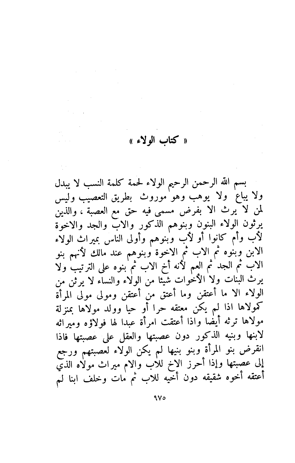 الولاء لحمة كلمة النسب لا يبدل ولا يباع ولا يوهب وهو موروث بطريق التعصيب وليس لمن لا يرث الا بفرض مسمى فيه حق مع العصبه والذين يرثون الولاء البنون وبنوهم الذكور والاب والجد والاخوة لاب وأم كانوا أو لأب وبنوهم وأولي الناس بميراث الولاء الابن وبنوه ثم الاب ثم الاخوة وبنوهم عند مالك لانهم بنو الاب ثم الجد ثم العم لانه اخ الاب ثم بنوه على الترتيب ولا يرث البنات ولا الاخوات شيئا من الولاء والنساء لا يرثن من الولاء الا ما اعتقن وما اعتق من اعتقن ومولى مولى المرأه كمولاها اذا لم يكن معتقه حرا أو حيا وولد مولاها بمنزلة مولاها ترثه أيضا واذا اعتقت امرأة عبدا لها فولاؤه وميراثه لابنها وبنيه الذكور دون عصبتها والعقل على عصبتها فإذا انقرض بنو المرأه وبنو بنيها لم يكن الولاء لعصبتهم ورجع الى عصبتها واذا احرز الاخ للاب والام ميراث مولاه الذي اعتقه أخوه شقيقه دون أخيه للاب ثم مات وخلف ابنا لم