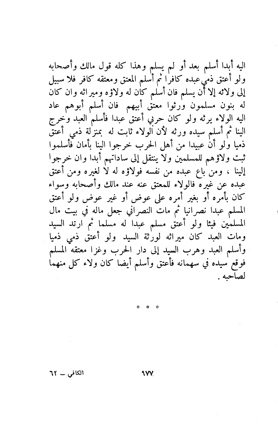 اليه أبدا أسلم بعد أو لم يسلم وهذا كله قول مالك وأصحابه ولو أعتق ذمي عبده كافرا ثم أسلم المعتق ومعتقه كافر فلا سبيل الى ولائه إلا أن يسلم فإن اسلم كان ولاؤه وميراثه وإن كان له بنون مسلمون ورثوا معتق ابيهم فإن اسلم ابوهم عاد اليه الولاء يرثه ولو كان حربي أعتق عبدا فأسلم العبد وخرج الينا ثم اسلم سيده ورثه لأن الولاء ثابت له بمنزلة ذمي اعتق ذميا ولو ان عبيدا من اهل الحرب خرجوا الينا بأمان فأسلموا ثبت ولاؤهم للمسلمين ولا ينتقل الى سادتهم ابدا وان خرجوا الينا ومن باع عبده من نفسه فولاؤه له لا لغيره ومن اعتق عبده عن غيره فالولاء للمعتق عنه عند مالك واصحابه وسواء كان بأمره او بغير أمره على عوض او غير عوض ولو أعتق المسلم عبدا نصرانيا ثم مات النصراني جعل ماله في بيت مال المسلمين فيئا ولو اعتق مسلم عبدا له مسلما ثم ارتد السيد ومات العبد كان ميراثه لورثة السيد ولو أعتق ذمي ذميا وأسلم العبد وهرب السيد إلى دار الحرب وغزا معتقه المسلم فوقع سيده في سهمانه فأعتق وأسلم أيضا كان ولاء كل منهما لصاحبه