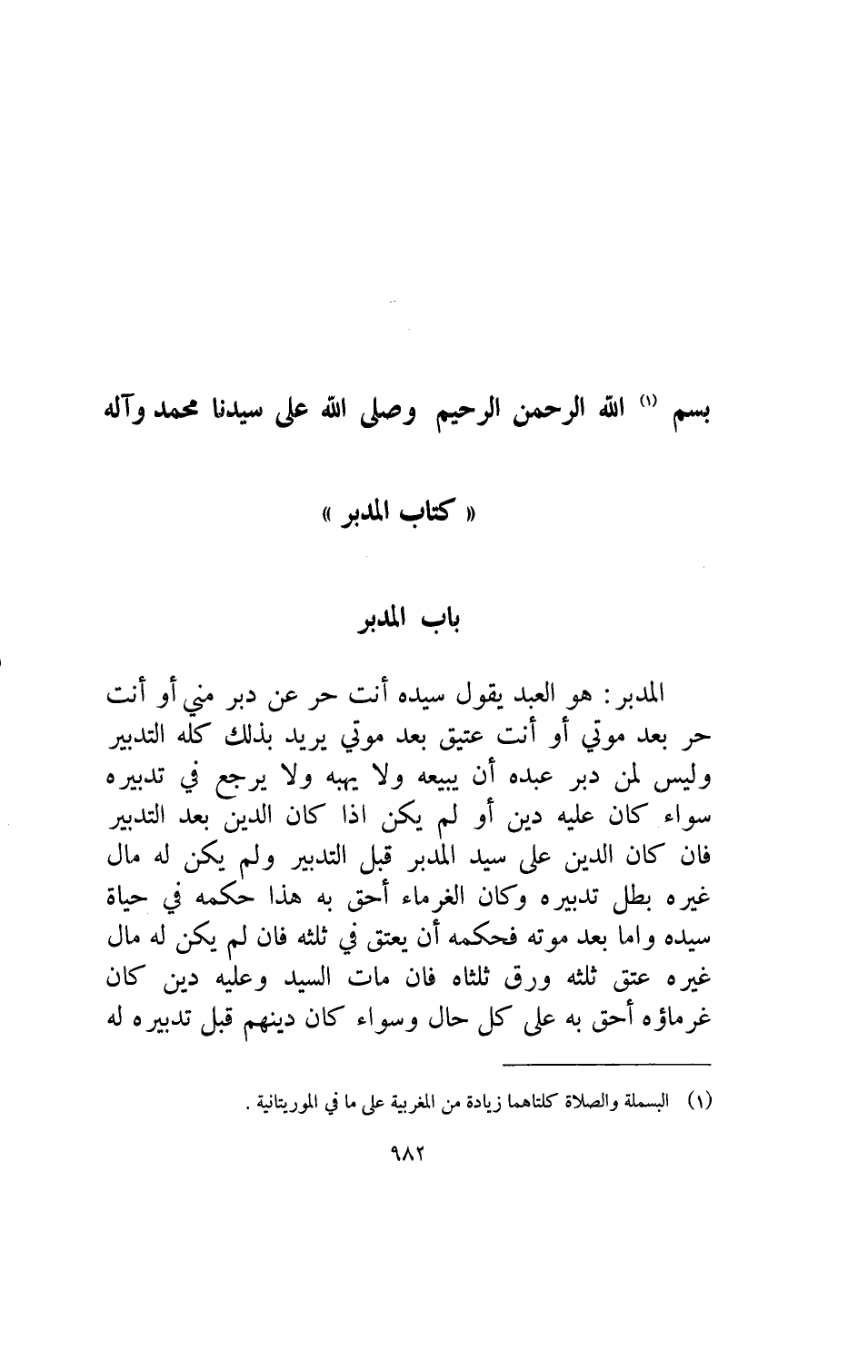 المدبر: هو العبد يقول سيده أنت حر عن دبر مني أو انت حر بعد موتي أو أنت عتيق بعد موتي يريد بذلك كله التدبير وليس لمن دبر عبده أن يبيعه ولا يهبه ولا يرجع في تدبيره سواء كان عليه دين أو لم يكن اذا كان الدين بعد التدبير فإن كان الدين على سيد المدبر قبل التدبير ولم يكن له مال غيره بطل تدبيره وكان الغرماء أحق به هذا حكمه في حياة سيده وأما بعد موته فحكمه أن يعتق في ثلثه فإن لم يكن له ما لغيره عتق ثلثه ورق ثلثاه فإن مات السيد وعليه دين كان غرماؤه أحق به على كل حال وسواء كان دينهم قبل تدبيره له