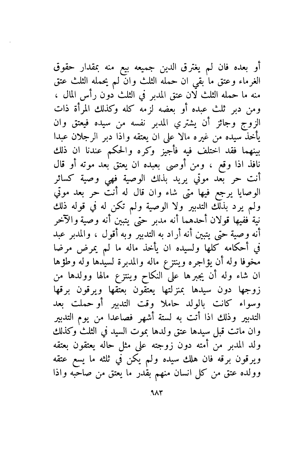 أو بعده فإن لم يغترق الدين جميعه بيع منه بمقدار حقوق الغرماء وعتق ما بقي ان حمله الثلث وإن لم يحمله الثلث عتق ما حمله الثلث لأن عتق المدبر في الثلث دون رأس المال ومن دبر ثلث عبده أو بعضه لزمه كله وكذلك المرأه ذات الزوج وجائز أن يشتري المدبر نفسه من سيده فيعتق وأن يأخذ سيده من غيره مالا على أن يعتقه وإذا دبر الرجلان عبدا بينهما فقد اختلف فيه فأجيز وكره والحكم عندنا ان ذلك نافذ إذا وقع ومن أوصى بعبده ان يعتق بعد موته أو قال أنت حر بعد موتى يريد بذلك الوصيه فهي وصية كسائر الوصايا يرجع فيها متى شاء وان قال له انت حر بعد موتي ولم يرد بذلك التدبير ولا الوصية ولم تكن له في قوله ذلك نية ففيها قولان أحدهما أنه مدبر حتى يتبين أنه وصية والآخر أنه وصية حتى يتبين أنه أراد به التدبير وبه أقول والمدبر عبد في أحكامه كلها ولسيده أن يأخذ ماله مالم يمرض مرضا مخوفا وله أن يؤجره وينتزع ماله والمدبرة لسيدها وله وطؤها ان شاء وله يجبرها على النكاح وينتزع مالها وولدها من زوجها دون سيدها بمنزلتها يعتقون بعتقها ويرقون برقها وسواء كانت بالولد حاملا وقت التدبير او حملت بعد التدبير وذلك إذا به لستة اشهر فصاعدا من يوم التدبير وان ماتت قبل سيدها عتق ولدها بموت السيد في الثلث وكذلك ولد المدبر من امته دون زوجته على مثل حاله يعتقون بعتقه ويرقون برقه فإن هلك سيده ولم يكن في ثلثه ما يسع عتقه وولده عتق من كل انسان منهم بقدر ما يعتق من صاحبه واذا