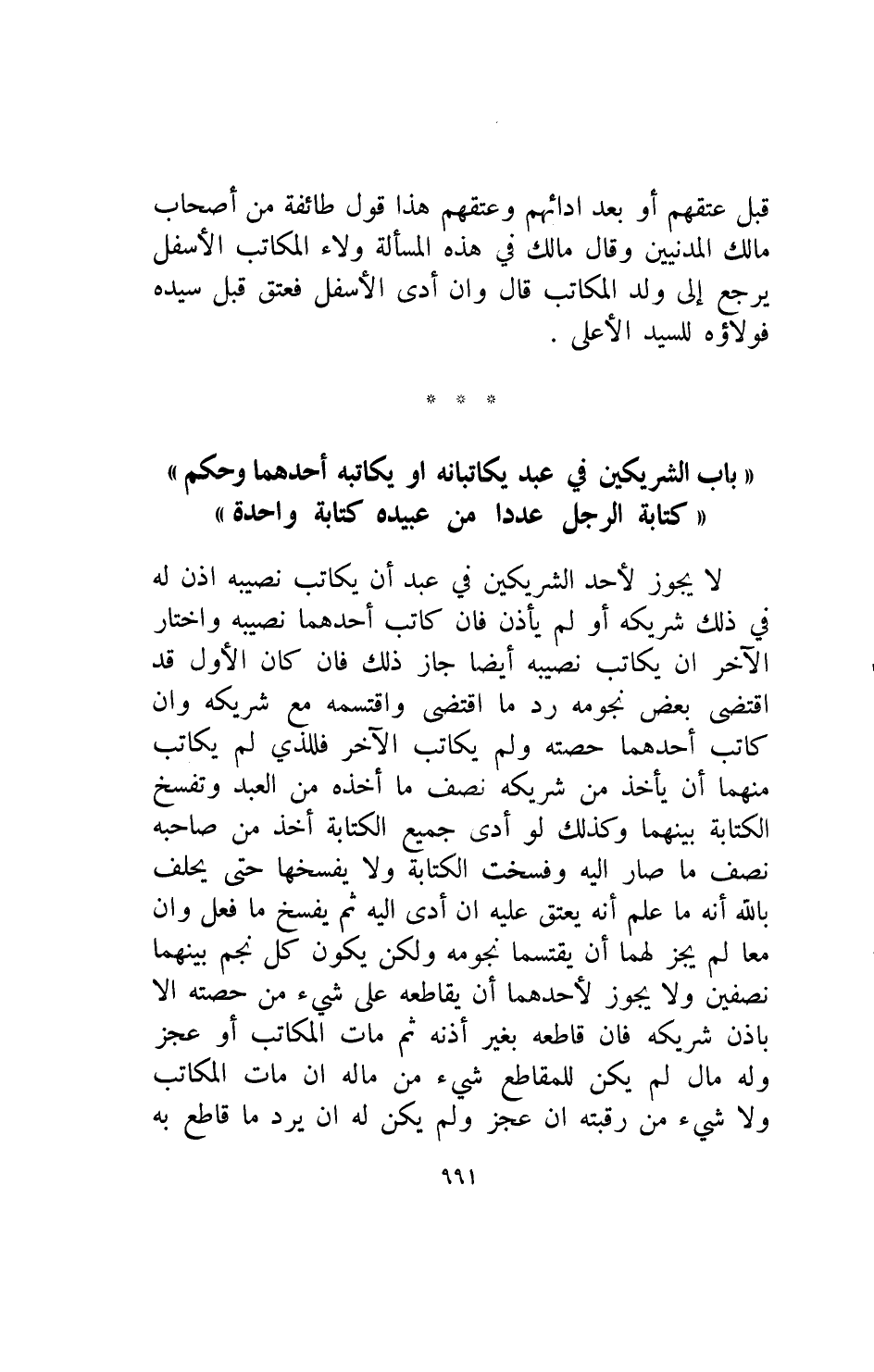 وحكم كتابة الرجل عددا من عبيده كتابة واحده لايجوز لاحد الشريكين في عبد ان يكاتب نصيبه اذن له في ذلك شريكه او لم يأذن فإن كاتب احدهما نصيبه واختار الاخر ان يكاتب نصيبه ايضا جاز ذلك فإن كان الاول قد اقتضى بعض نجومه رد ما اقتضى واقتسمه مع شريكه وان كاتب احدهما حصته ولم يكاتب الاخر فللذي لم يكاتب منهما ان يأخذ من شريكه نصف ما اخذه من العبد وتفسخ الكتابه بينهما وكذلك لو ادى جميع الكتابه اخذ من صاحبه نصف ما صار اليه وفسخت الكتابه ولا يفسخها حتى يحلف بالله انه ما علم انه يعتق عليه ان ادى اليه ثم يفسخ ما فعل وان معا لم يجز لهما ان يقتسما نجومه ولكن يكون كل نجم بينهما نصفين ولا يجوز لاحدهما ان يقاطعه على شيء من حصته الا بإذن شريكه فإن قاطعه بغير اذنه ثم مات المكاتب او عجز وله مال لم يكن للمقاطع شيء من ماله ان مات المكاتب ولا شيء من رقبته ان عجز ولم يكن له ان يرد ما قاطع به