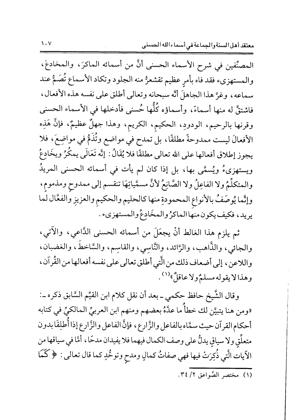 المصتفين في شرح الأسماء الحسنى أن من أسمائه الماكر، والمخادع، والمستهزىء فقد فاه بأمير عظيم تقشعرّ منه الجلود وتكاد الأسماع تُصمّ عند سماعه، وغرّ هذا الجاهل أنه سبحانه وتعالى، أطلق على نفسه هذه الأفعال، فاشتق له منها أسماء، وأسماؤه كلّها حسنى، فأدخلها في الأسماء الحسنى وقرنها بالرحيم، الودود، الحكيم، الكريم، وهذا جهل عظيم، فإن هذه الأفعال ليست ممدوحة مطلقا، بل تمدح في مواضع وتُذمّ في مواضع، فلا يجوز إطلاق أفعالها على الله تعالى مطلقا فلايُقال: إنّه تعالى يمكُرُ ويُخَادع ويستهزىء ويُسمَّى بها، بل إذا كان لم يأت في أسمائه الحسنى المريد والمتكلِّم ولا الفاعل ولا الصانع لأن مسمّياتها تنقسم إلى ممدوع ومذموم، وإنّما يوصف با لأنواع المحمودة منها كالحليم والحكيم والعزيز والفعّال لما يريد، فكيف يكون منها الماكرُ والمخادعُ والمستهزىء.