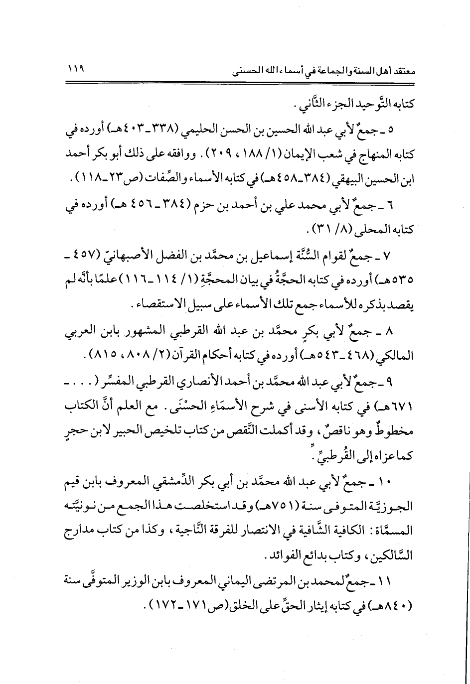 7- جمع لقوام السُّنَّة إسماعيل بن محمَّند بن الفضل الأصبهانيّ (457- 535 هـ) أورده في كتابه الحُجَّة في بيان المحجَّة (1/ 114-116) علمًا بأنه لم يقصدبذكره للأسماء جمع تلك الأسماء علىسبيل الاستقصاء.