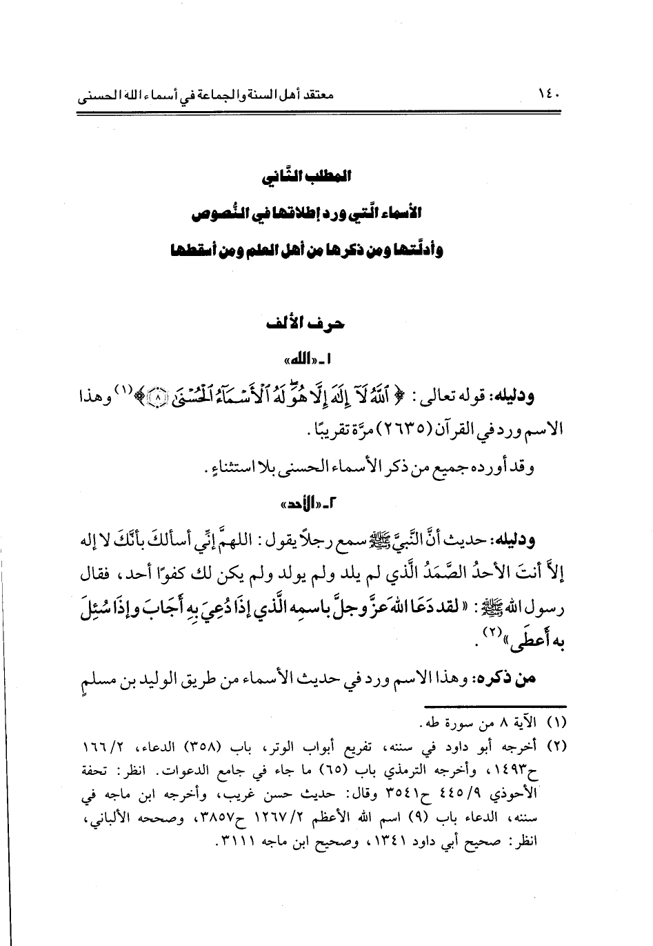 ودليله: حديث أنَّ النَّبىَّ صلى الله عليه وسلم سمع ر جلاً يقول: اللهمَّ إنِّي أسألك بأنَّك لاإله إلاّ أنت الأحد الصمد الذي لم يلد ولم يولد ولم يكن لك كفوًا أحد، فقال رسول الله صلى الله عليه وسلم: "لقد دعا الله عزّ وجل با سمه الَّذي إذا دُعِي به أجاب وإذا سُئِلَ به أعطى". 2