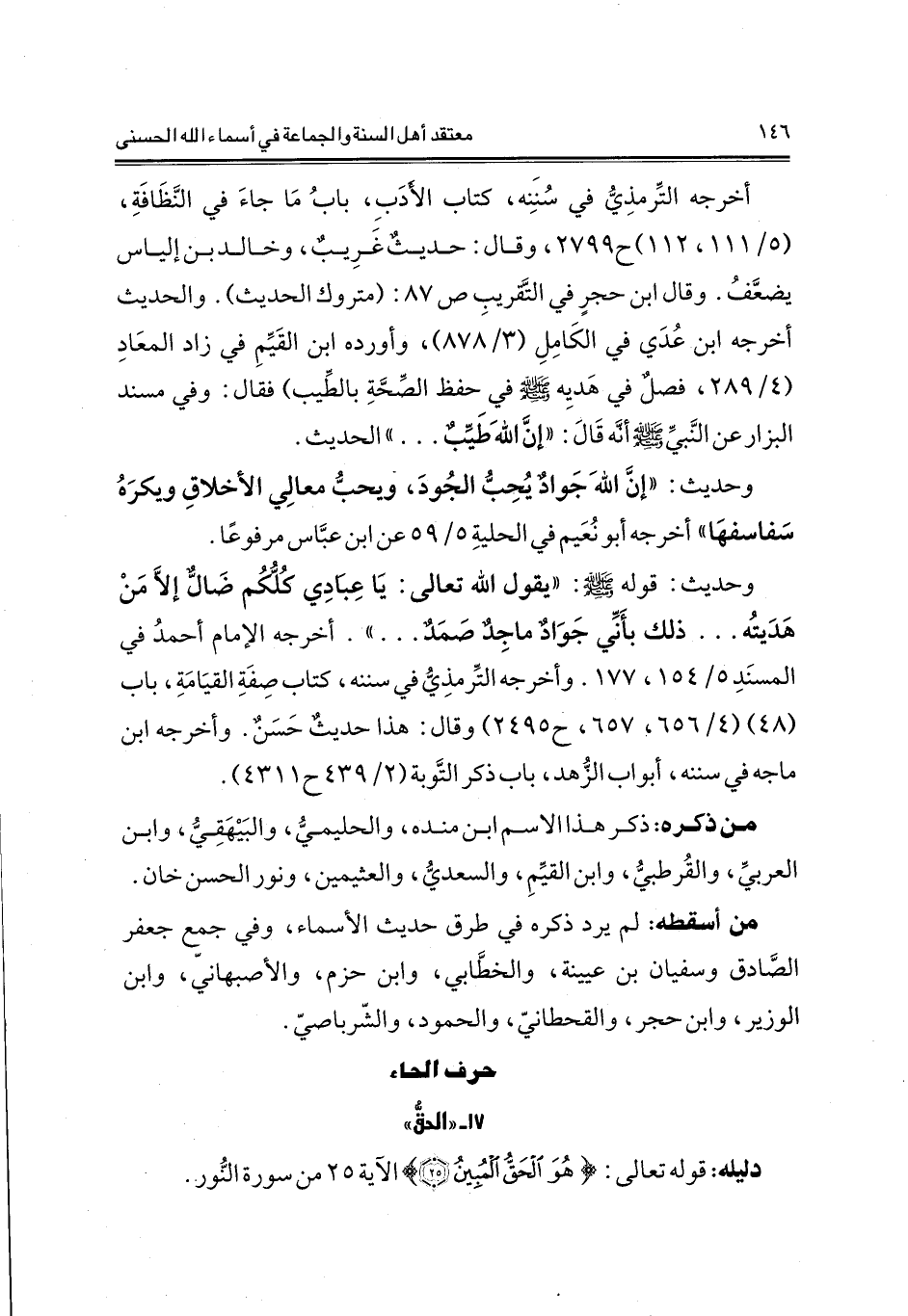 وحديث: قوله: صلى الله عليه وسلم «يقول الله تعالى: ياعِبَادِي كُلُّكُم ضَالٌّ إلاَّ مَن هَدَيتُه ... ذلك بأَنِّي جَوَادٌ مَاجِدٌ صَمَدٌ ... » . أخرجه الإمام أحمدُ في المسنَدِ 5/ 154، 177. وأخرجه التِّرمذيُّ في سننه، كتاب صِفَةِ القيامة، باب (48) (4/ 656، 657، ح هـ 249) وقال: هذا حديث حَسَنٌ. وأخرجه ابن ماجه في سننه، أبواب الزُّهد، باب ذكر التَّوبة (2/ 439 ح 1 431) .