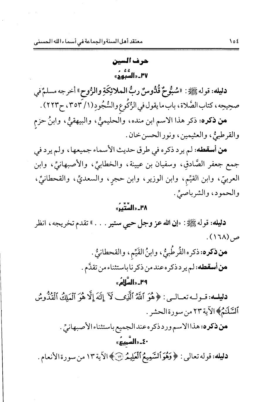 من أسقطه: لم يرد ذكره في طرق حديث الأسماء جميعها، ولم يرد في جمع جعفر الصَّادق، وسفيان بن عيينة، والخطابيِّ، والأصبهانيِّ، وابن العربيِّ، وابن القيِّم، وابن الوزير، وابن حجر، والسعديِّ، والقحطانيِّ، والحمود، والشربا صيِّ.