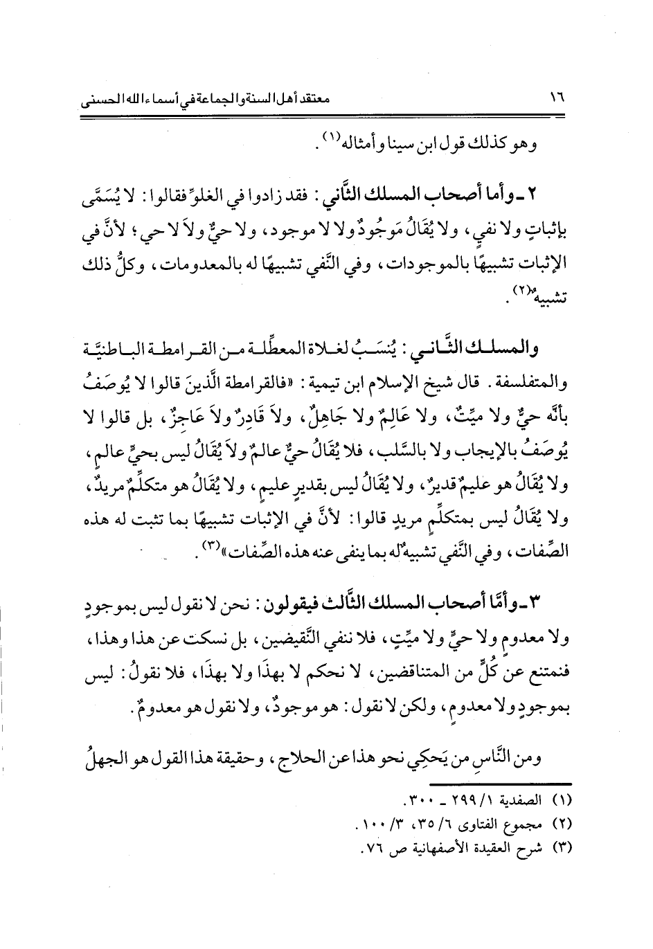 2- وأما أصحاب المسلك الثاني: فقد زادوا في الغلو فقالوا: لا يسمى بإثباب ولا نفي، ولا يقال موجود ولا لا موجود، ولا حي ولا لا حي، لأن في الإثبات تشبيها بالموجودات، وفي النفي تشبيها له بالمعدومات، وكل ذلك تشبيه2.