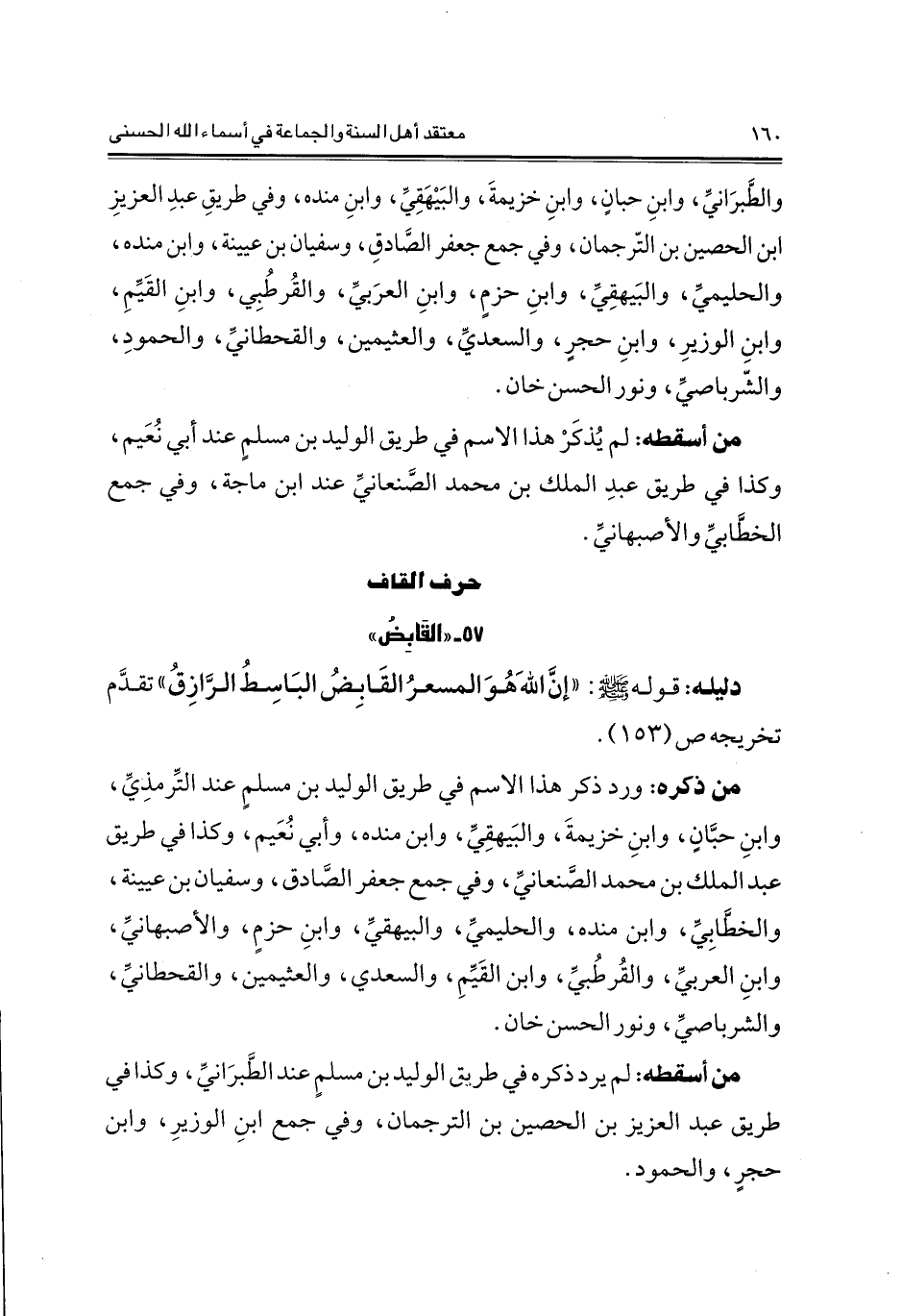 من ذكره: ورد ذكر هذا الاسم في طريق الوليد بن مسلم عند التِّرمذيِّ، وابنِ حبَّان، وابنِ خزيمة، والبَيهَقيّ، وابن منده، وأبي نُعَيم، وكذا في طريق عبد الملك بن محمد الصَّنعانيِّ، وفي جمع جعفر الصَّادق، وسفيان بن عيينة، والخطَّاييِّ، وابن منده، والحليميِّ، والبيهقيِّ، وابنِ حزم، والأصبهانيِّ، وابنِ العربيِّ، والقرطبيِّ، وابن القيِّم، والسعديِّ، والعثيمين، والقحطانى، والشرباصيِّ، ونور الحسن خان.