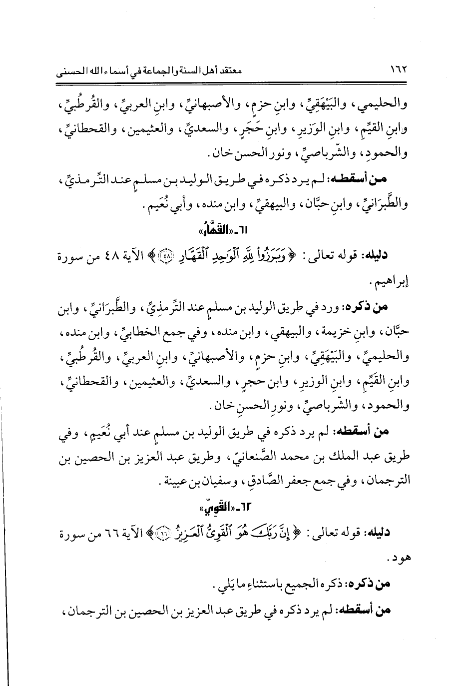 والحليميِّ، وا لبَيهَقيِّ، وابنِ حزم، والأصبها نيِّ، وا بنِ العربيِّ، والقرطبيِّ، وابنِ القيِّم، وابنِ الوزير، وابنِ حجر، والسعديِّ، والعثيمين، والقحطانيِّ، والحمود، والشرباصيِّ، ونور الحسن خان.