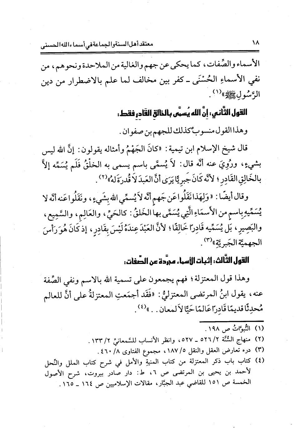 وقال أيضا: "ؤلهذا نقلوا عن جهم أنه لا يسمي الله بشيء، ونقلوا عنه أنه لا يسميه باسم من الأسماء التي يسمي بها الخلق: كالحي، والعالم، والسميع، والبصير، بل يسميه قادرا خالقا لأن العبد عنده ليس بقادر، إذ كان هؤ رأس الجهمية الجبرية"3