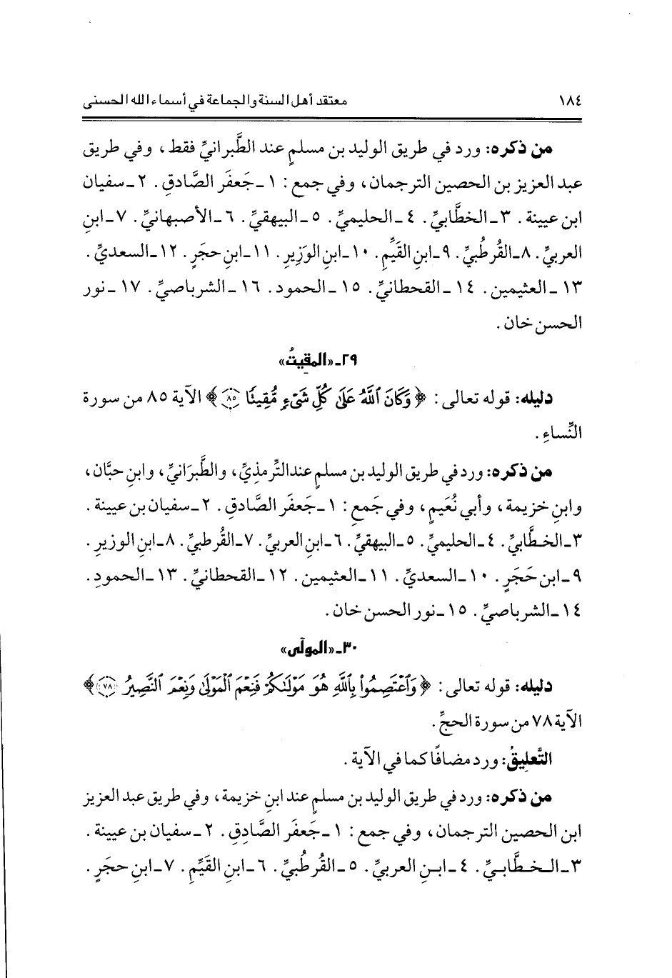 من ذكره: ورد في طريق الوليد بن مسلم عندالتِّرمذيِّ، والطَّبَرانيِّ، وابنِ حبَّان، وابنِ خزيمة، وأبي نُعَيم، وفي جمع: ا- جعفر الصَّادق. 2- سفيان بن عيينة. 3- الخطابيِّ. 4- الحليميِّ. 5- البيهقيِّ. 6- ابنِ العربيِّ. 7- القُرطُبيِّ. 8- ابنِ الوزير. 9- ابن حجر. 10- السعديِّ. 11- العثيمين. 12- القحطانيِّ. 13- الحمود. 14- الشَّرباصيِّ. 15- نور الحسن خان.