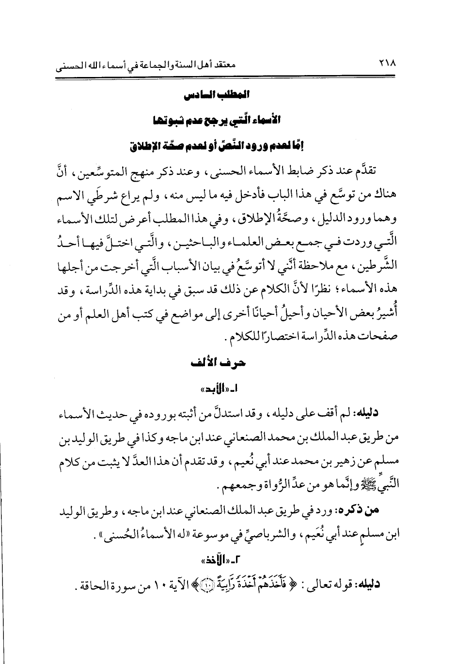 المطلب السادس: الأسماء التى يرجح عدم ثبوتها إمَّالعدم ورود النَّصِّ أولعدم صحة الإطلاق