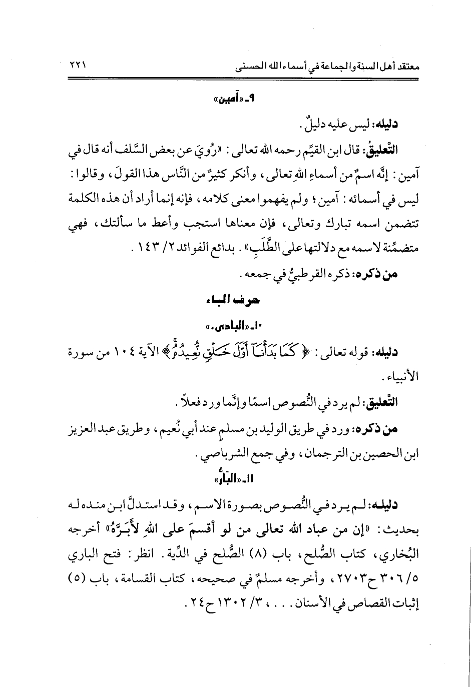 دليله: لم يرد في النُّصوص بصورة الاسم، وقد استدلَّ ابن منده له بحديث "إن من عباد الله تعالى من لوأقسم علىالله لأبَرَّه" أخرجه البخاري، كتاب الصلح، باب (8) الصُّلْح في الدِّيَّة. انظر: فتح الباري 5/ 306 ح 2703، وأخرجه مسلم في صحيحه، كتاب القسامة، باب (5) إثبات القصاص في الأسنان 000، 3/ 1302 ح 24.