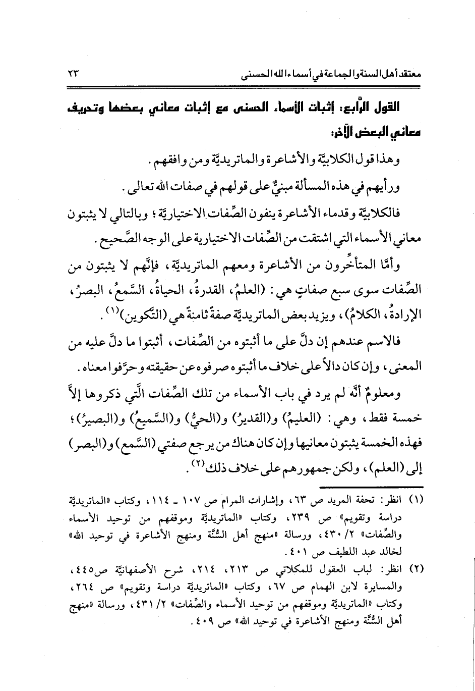 وأما المتأخرون من الأشاعرة ومعهم الماتريدية، فإنهم لا يثبتون من الصفات سوى سبع صفاب هي: (العلم، القدرة، الحياة، الجمع، البصر، الإرادة، الكلام) ، ويزيد بعض الماتريدية صفة ثامنة هي (التكوين) 1 فالاسم عندهم إن دل على ما أثبتوه من الصفات، أثبتوا ما دل عليه من المعنى، وإن كان دالا على خلاف ما أثبتوه صرفوه عن حقيقته وحرفوا معناه. ومعلوم أنه لم يرد في باب الأسماء من تلك الصفات التي ذكروها إلا خمسة فقط، وهي: (العليم) و (القدير) و (الحي) و (السميع) و (البصير) فهذه الخمسة يثبتون معانيها وإن كان هناك من يرجع صفتي (السمع) و (البصر) إلى (العلم) ، ولكن جمهورهم على خلاف ذلك2