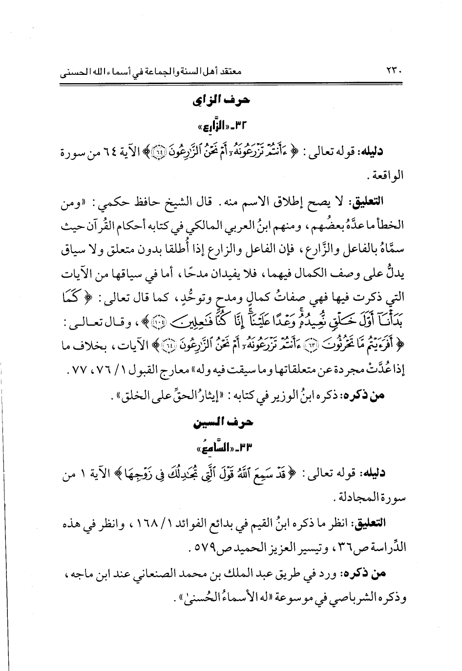 دليله: قوله تعالى: {أَأَنْتُمْ تَزْرَعُونَهُ أَمْ نَحْنُ الزَّارِعُونَ} . (الواقعة:64) . التعليق: لا يصح إطلاق الاسم منه. قال الشيخ حافظ حكمي: "ومن الخطأ ما عدَّه بعضهم، ومنهم ابن العربي المالكي في كتابه أحكام القرآن حيث سمَّاه بالفاعل والزَّارع، فإن الفاعل والزارع إذا أُطلقا بدون متعلق ولا سياق يدلُّ على وصف الكمال فيهما، فلا يفيدان مدحا، أما في سياقها من الآيات التي ذكرت فيها فهي صفات كمال ومدح وتوحَّد، كما قال تعالى: {كَمَا بَدَأْنَا أَوَّلَ خَلْقٍ نُعِيدُهُ وَعْداً عَلَيْنَا إِنَّا كُنَّا فَاعِلِينَ} .. وقال تعالى: {أَفَرَأَيْتُمْ مَا تَحْرُثُونَ أَأَنْتُمْ تَزْرَعُونَهُ أَمْ نَحْنُ الزَّارِعُونَ} . الآيات، بخلاف ما إذا عدت مجردة عن متعلقاتها وما سيقت فيه وله" معارج القبول 1/ 76، 77.