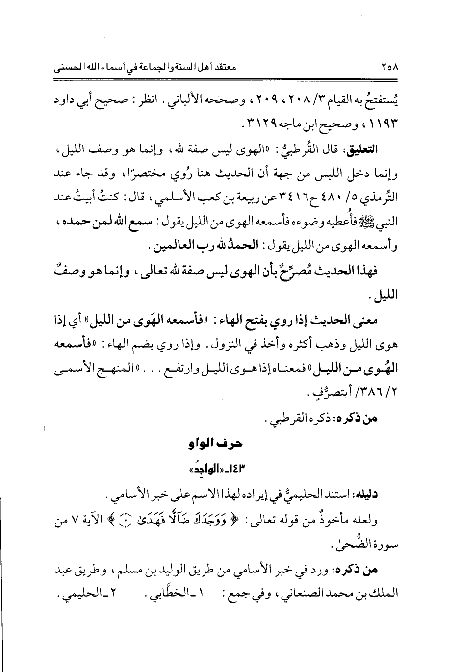 التعليق: قال القرطبي: "الهوى ليس صفة لله، وإنما هو وصف الليل، وإنما دخل اللبس من جهة أن الحديث هنا روي مختصرا، وقد جاء عند التِّرمذي 5/ 480 ح 3416 عن ربيعة بن كعب الأسلمي، قال: كنت أبيت عند النبي صلى الله عليه وسلم فأعطيه وضوءه فأسمعه الهوى من الليل يقول: سمع الله لمن حمده، وأسمعه الهوى من الليل يقول: الحمد لله رب العالمين.