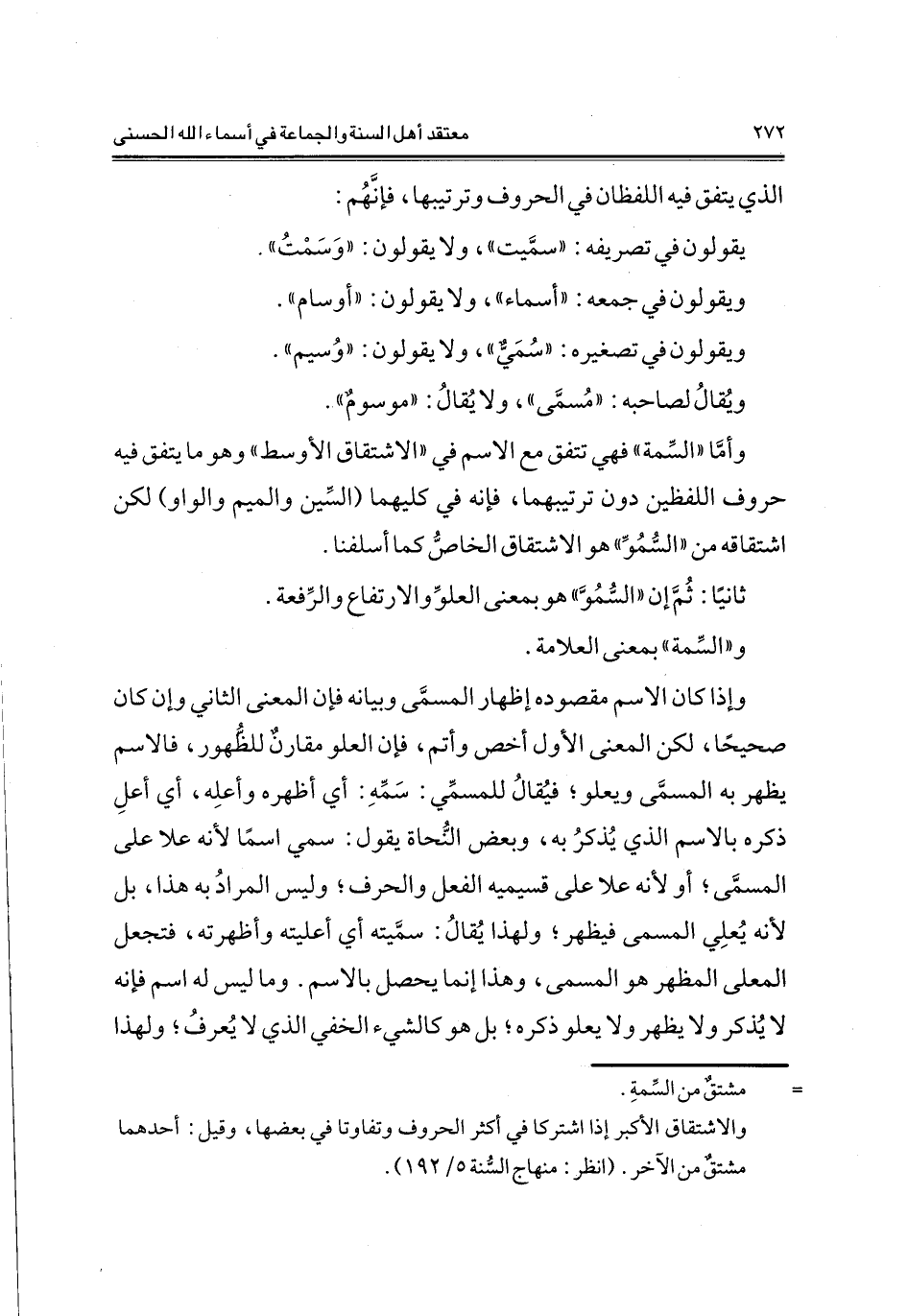 وإذا كان الاسم مقصوده إظهار المسمَّى وبيانه فإن المعنى الثاني وإن كان صحيحا، لكن المعنى الأول أخص وأتم، فإن العلو مقارن للظُّهور، فالاسم يظهر به المسمَّى ويعلو؛ فيقالُ للمسمِّي: سمِّهِ: أي أظهره وأعلِه، أي أعلِ ذكره بالاسم الذي يُذكرُ به، وبعض النحاة يقول: سمي اسمًا لأنه علا على المسمَّى؛ أو لأنه علا على قسيميه الفعل والحرف؛ وليس المراد به هذا، بل لأنه يُعلي المسمى فيظهر؛ ولهذا يقالُ: سمَّيته أي أعليته وأظهرته، فتجعل المعلى المظهر هو المسمى، وهذا إنما بحصل بالاسم. وما ليس له اسم فإنه لا يُذكر ولا يظهر ولا يعلو ذكره؛ بل هو كالشيء الخفي الذي لا يُعرفُ؛ ولهذا يقال: