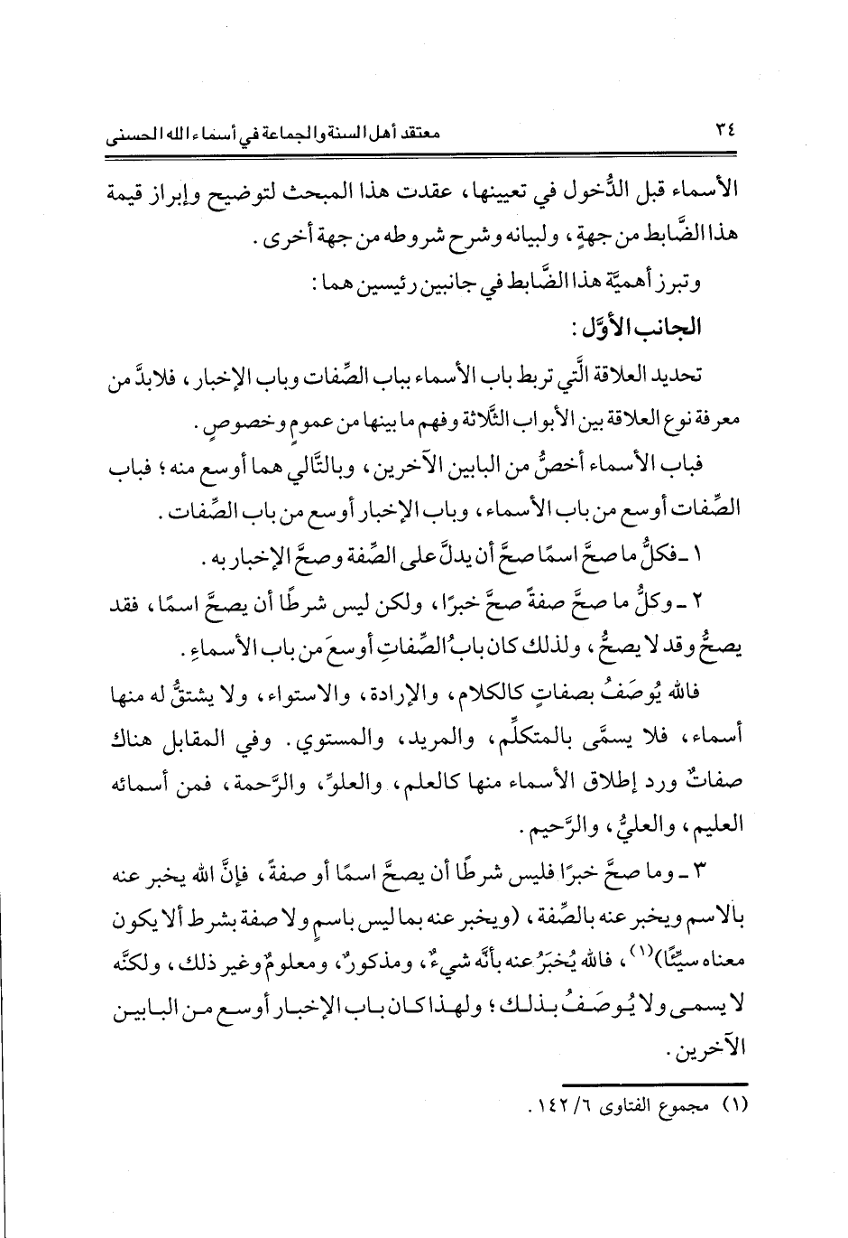 تحديد العلاقة التي تربط باب الأسماء بباب الصفات وباب الإخبار، فلابد من معرفة نوع العلاقة بين الأبواب الثلاثة وفهم ما بينها من عموم وخصوص.