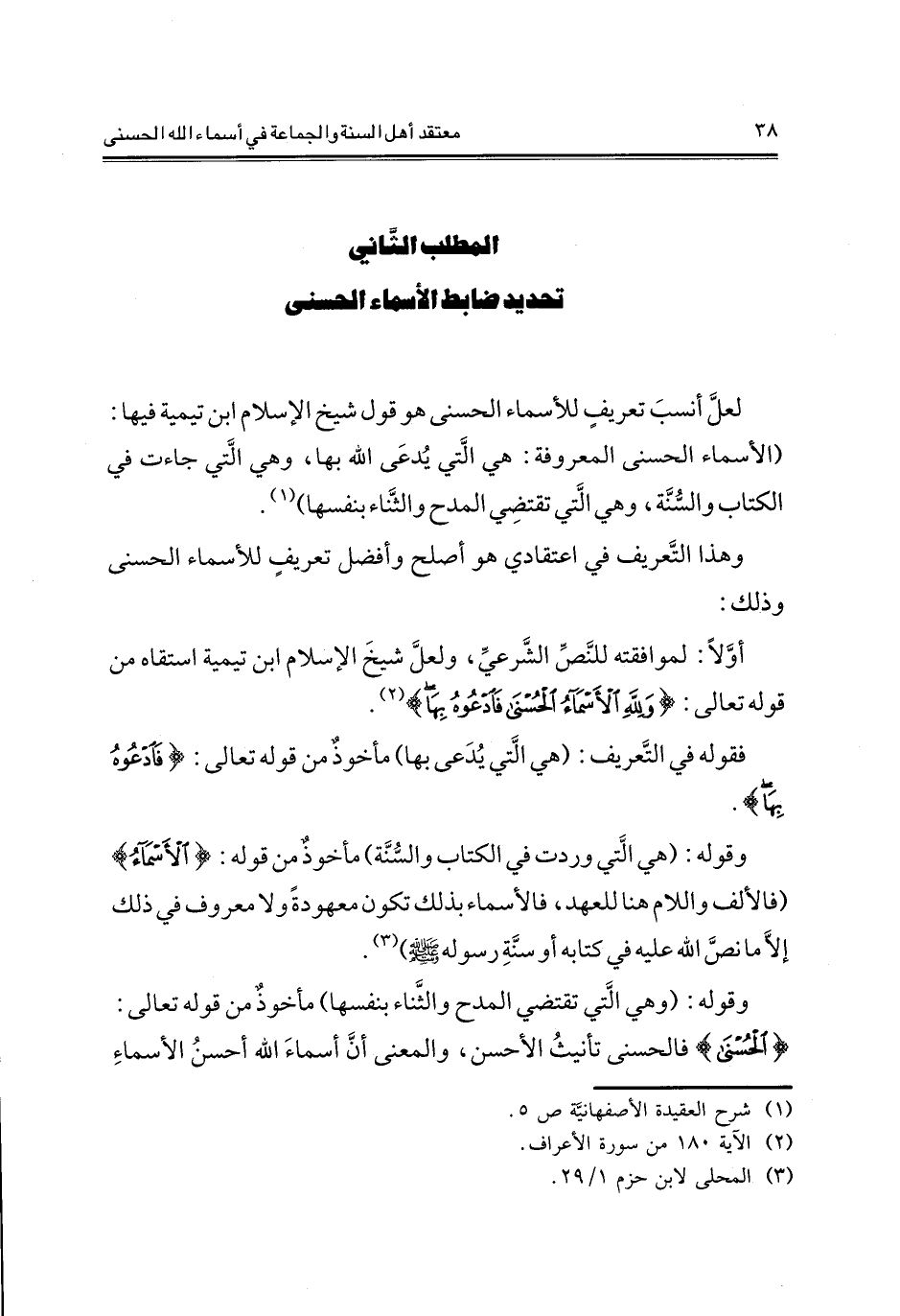 وقوله: "هي التي وردت في الكتاب والسنة" مأخوذ من قوله: {الأَسْمَاءُ} (فالألف واللام هنا للعهد، فالأسماء بذلك، تكون معهودة ولا معروف في ذلك إلا ما نص الله عليه في كتابه أوسنة رسوله صلى الله عليه وسلم) 3.