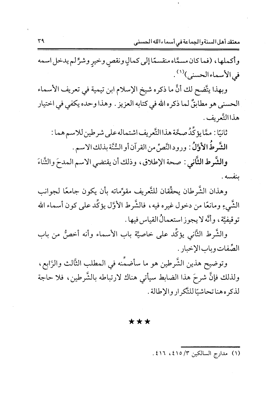 وهذان الشرطان يحققان للتعريف مقوماته بأن يكون جامعا لجوانب الشيء ومانعا من دخول غيره فيه، فالشرط الأول يؤكد على كون أسماء الله توقيفية، وأنه لا يجوز استعمال القياس فيها.