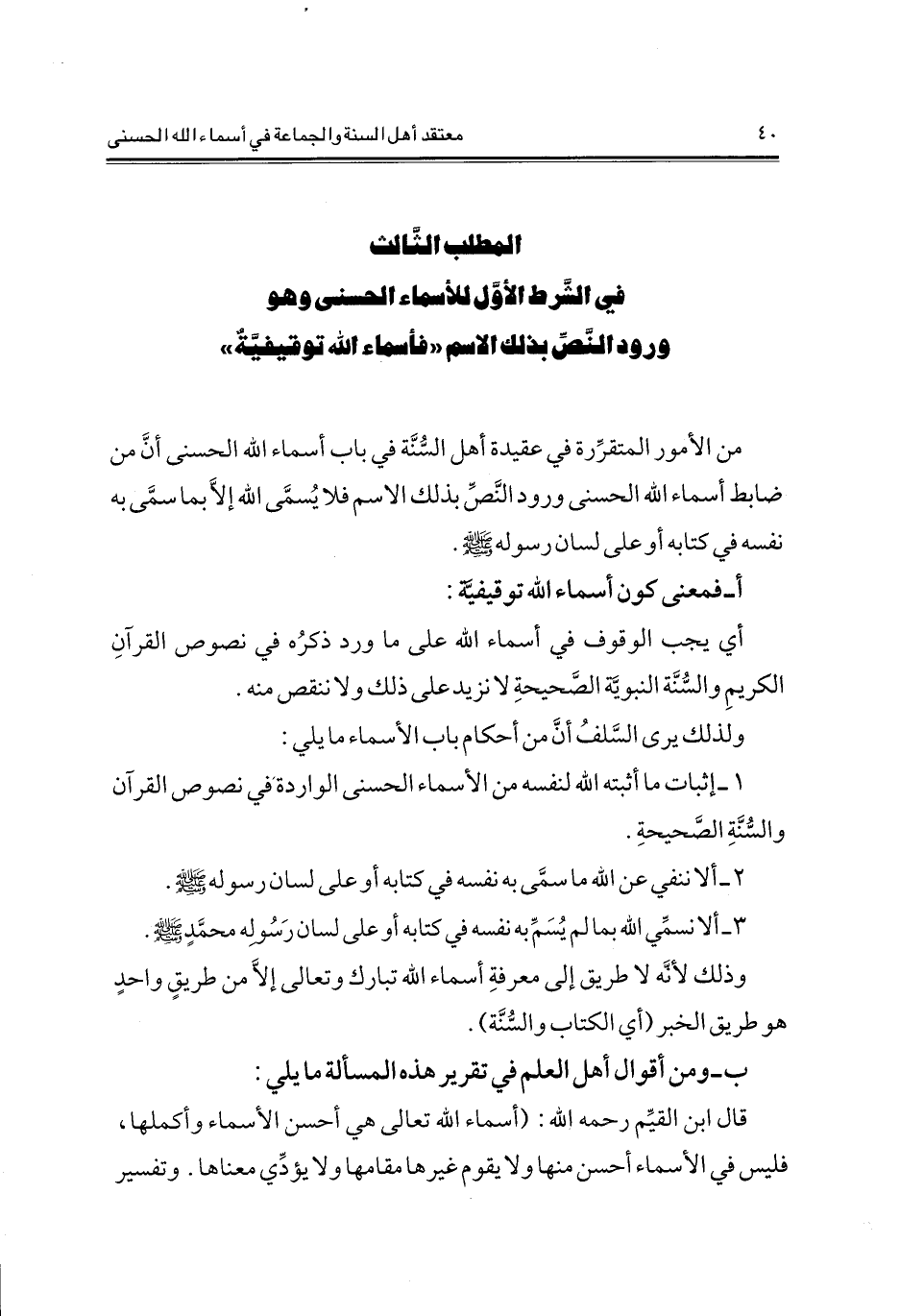 المطلب الثالث: في الشرط الأول للأسماء الحسنى وهو ورود النص بذلك الإسم " فأسماء الله توقيفية"