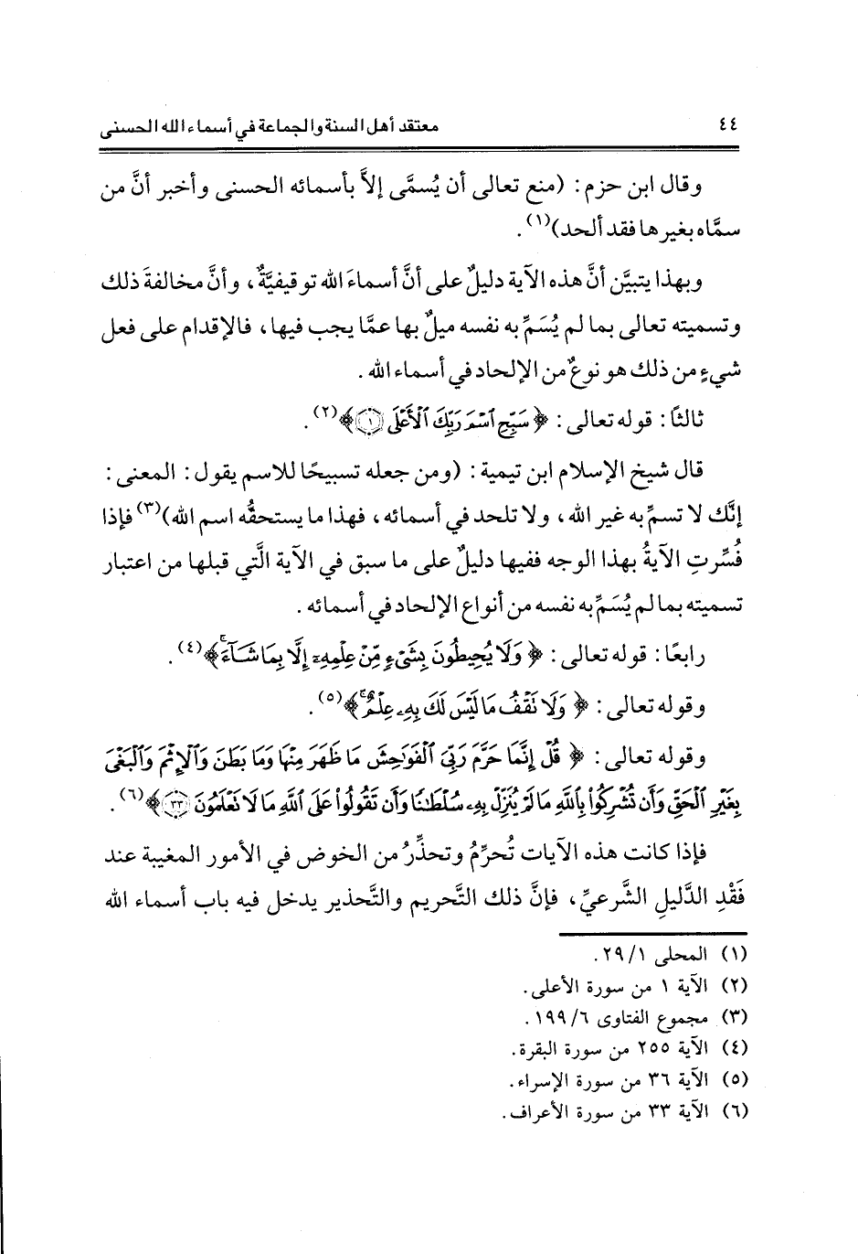 وقوله تعالى: {قُلْ إِنَّمَا حَرَّمَ رَبِّيَ الْفَوَاحِشَ مَا ظَهَرَ مِنْهَا وَمَا بَطَنَ وَالْأِثْمَ وَالْبَغْيَ بِغَيْرِ الْحَقِّ وَأَنْ تُشْرِكُوا بِاللَّهِ مَا لَمْ يُنَزِّلْ بِهِ سُلْطَاناً وَأَنْ تَقُولُوا عَلَى اللَّهِ مَا لا تَعْلَمُونَ} 6. فإذا كانت هذه الآيات تحرم وتحذر من الخوض في الأمور المغيبة عند فقد الدليل الشرعي، فإن ذلك التحريم والتحذير يدخل فيه باب أسماء الله