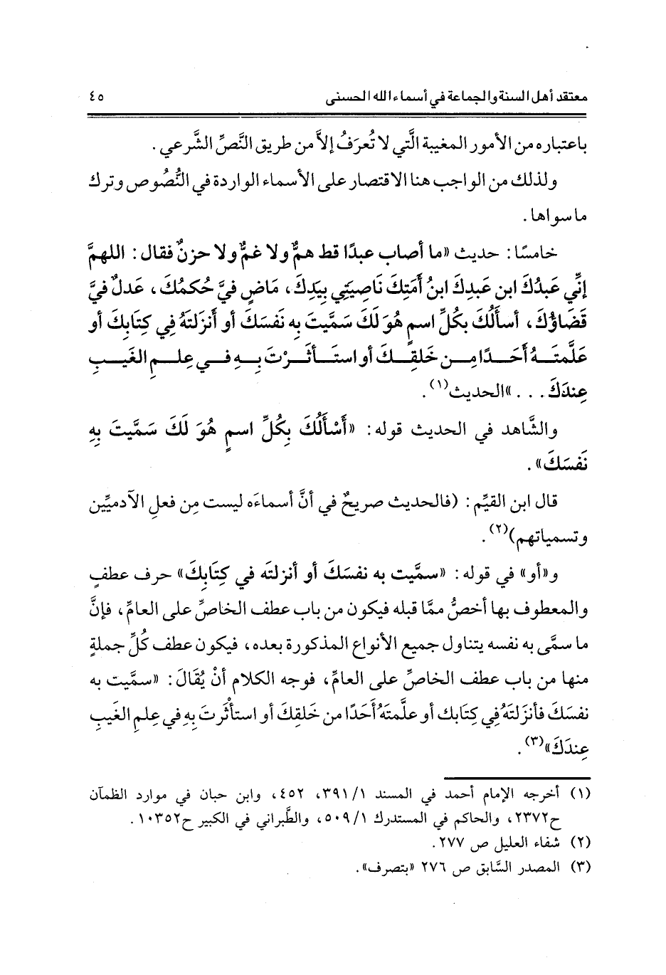 خامسا: حديث "ما أصاب عبدا قط هم ولا غم ولا حزن فقال: اللهم إني عبدك ابن عبدك ابن أمتك ناصيتي بيدك، ماض في حكمك، عدل في قضاؤك، أسألك بكل اسم هو لك سميت به نفسك أو أنزلته في كتابك أو علمته أحدا من خلقك أو استأثزت به في علم الغيب عندك ... " الحديث1 والشاهد في الحديث قوله: "أسألك بكل اسم هو لك سميت به نفسك".