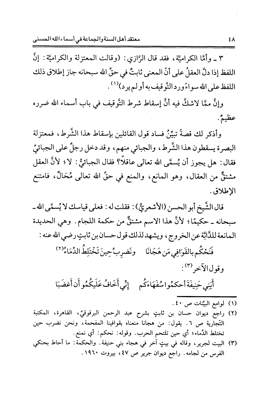 3- وأما الكرامية، فقد قال الرازي: (وقالت المعتزلة والكرامية: إن اللفظ إذا دل العقل على أن المعنى ثابت في حق الله سبحانه جاز إطلاق ذلك اللفظ على الله سواء ورد التوقيف به أو لم يرد) 1.