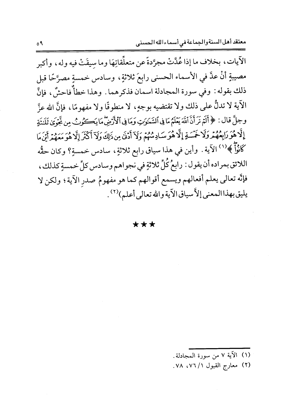الآيات، بخلاف ما إذا عدت مجردة عن متعلقاتها وما سيقت فيه وله، وأكبر مصيبة أن عد في الأسماء الحسنى رابع ثلاثة، وسادس خمسة مصرحا قبل ذلك بقوله: وفي سورة المجادلة اسمان فذكرهما. وهذا خطأ فاحشة، فإن الآية لا تدل على ذلك ولا تقتضيه بوجه، لا منطوقا ولا مفهوما، فإن الله عز وجل قال: {أَلَمْ تَرَ أَنَّ اللَّهَ يَعْلَمُ مَا فِي السَّمَاوَاتِ وَمَا فِي الْأَرْضِ مَا يَكُونُ مِنْ نَجْوَى ثَلاثَةٍ إِلاَّ هُوَ رَابِعُهُمْ وَلا خَمْسَةٍ إِلَّا هُوَ سَادِسُهُمْ وَلا أنى مِنْ ذَلِكَ وَلا أَكْثَرَ إِلَّا هُوَ مَعَهُمْ أَيْنَ مَا كَانُوا ثُمَّ يُنَبِّئُهُمْ بِمَا عَمِلُوا يَوْمَ الْقِيَامَةِ إِنَّ اللَّهَ بِكُلِّ شَيْءٍ عَلِيمٌ} 1 الآية. وأين في هذا سياق رابع ثلاثة، سادس خمسة؟ وكان حقه اللائق بمراده أن يقول: رابع كل ثلاثة في نجواهم وسادس كل خمسة كذلك، فإنه تعالى يعلم أفعالهم ويسمع أقوالهم كما هو مفهوم صدر الآية، ولكن لا يليق بهذا المعنى إلا سياق الآية والله تعالى أعلم) 2.