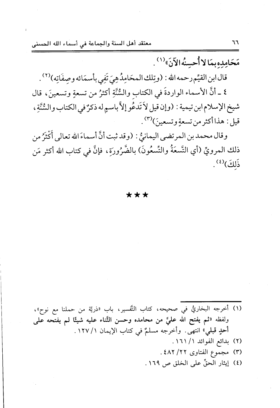 وقال محمد بن المرتضى اليماني: (وقد ثبت أن أسماء الله تعالى أكثر من ذلك المروي (أي التسعة والتسعون) بالضرورة، فإن في كتاب الله أكثر من ذلك) 4.