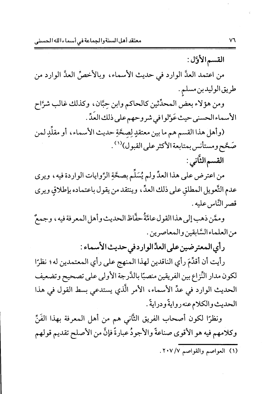(وأهل هذا القسم هم ما بين معتقد لصحة حديث الأسماء، أو مقلد لمن صحح ومستأنس بمتابعة الأكثرعلى القبول)