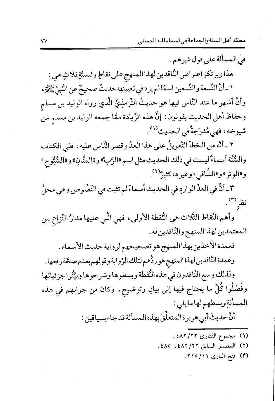 2- أنه من الخطأ التعويل على هذا العد وقصر الناس عليه، ففي الكتاب والسنة أسماء ليست في ذلك الحديث مثل اسم "الرب" و"المنان" " و "السبوح " و "الوتر" و"الشافي" وغيرها كثير2.