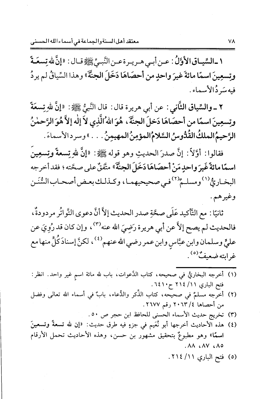 2- والسياق الثاني: عن أبي هريرة قال: قال النبي صلى الله عليه وسلم: "إن لله تسعة ؤتسعين اسما من أحصاها دخل الجتة، فو الله الذي لآ إله إلا هو الرحمن الرحيم الملك القدوس السلام المؤمن المهيمن. " وسرد الأسماء. فقالوا: أولا: إن صدر الحديث وهو قوله صلى الله عليه وسلم: "إن لله تسعة وتسعين اسما مائة غير واحد من أحصاها دخل الجنة" متفق على صحته، فقد أخرجه البخاري1 ومسلم2 في صحيحيهما، وكذلك بعض أصحاب السنن وغيرهم.