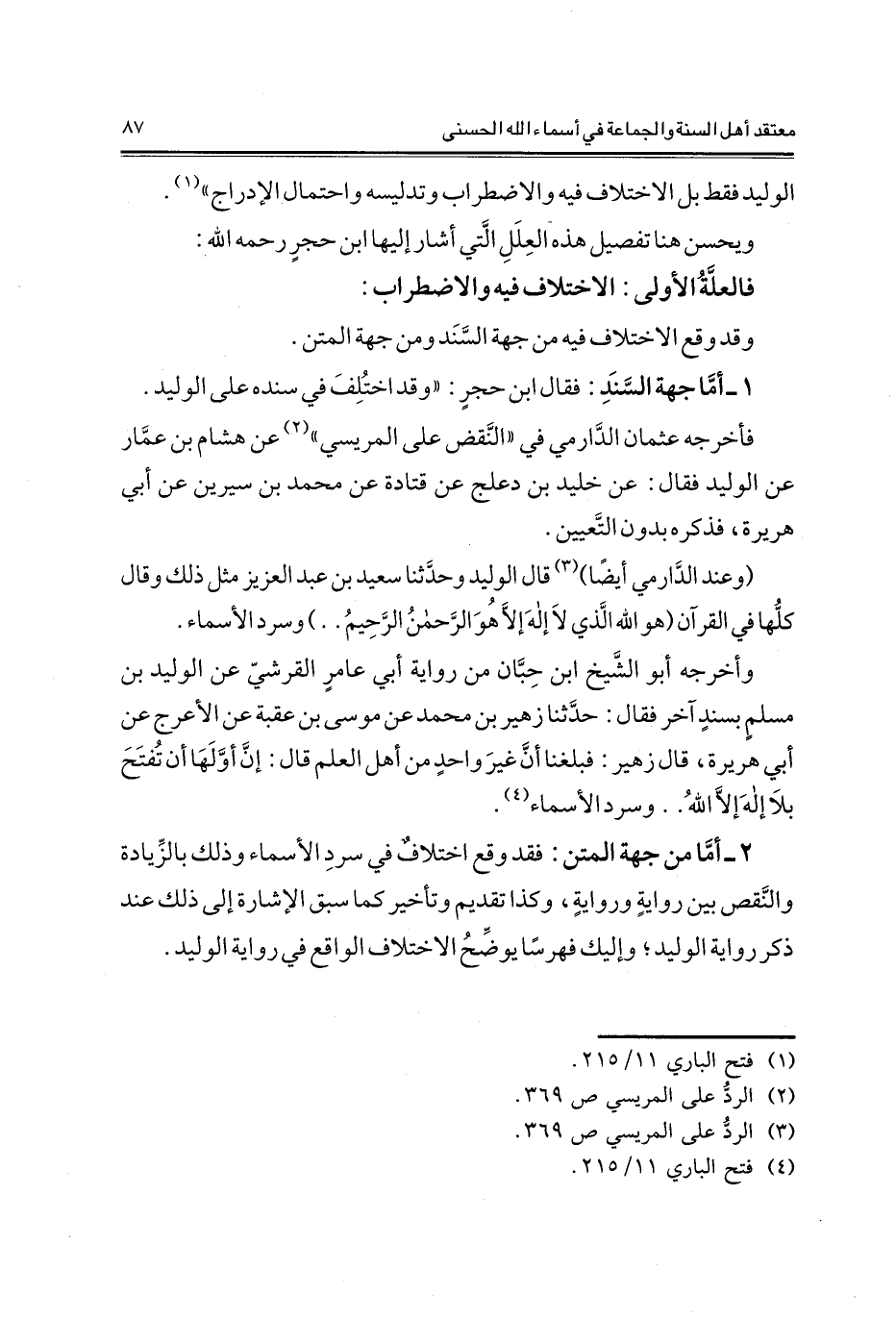 1- أما جهة السند: فقال ابن حجر: "وقد اختلف في سنده على الوليد. فأخرجه عثمان الدارمي في "النقض على المريسي"2 عن هشام بن عمار