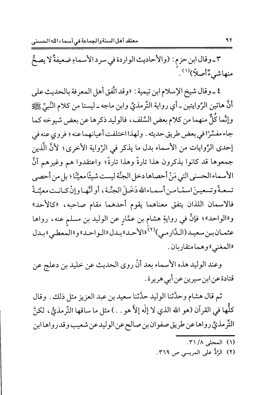 4- وقال شيخ الإسلام ابن تيمية: "وقد اتفق أهل المعرفة بالحديث على أن هاتين الروايتين- أي رواية التزمذي وابن ماجه- ليستا من كلام النبي صلى الله عليه وسلم وإنما كل منهما من كلام بعض السلف، فالوليد ذكرها عن بعض شيوخه كما جاء مفسرا في بعض طريق حديثه. ولهذا اختلفت أعيانهما عنه، فروي عنه في إحدى الروايات من الأسماء بدل ما يذكر في الرواية الأخرى، لأن الذين جمعوها قد كانوا يذكرون هذا تارة وهذا تارة، واعتقدوا هم وغيرهم أن الأسماء الحسنى التي من أحصاها دخل الجنة ليست شيئا معينا، بل من أحصى تسعة وتسعين اسما من أسماء الله دخل الجنة، أو أنها وإن كانت معينة فالاسمان اللذان يتفق معناهما يقوم أحدهما مقام صاحبه، "كالأحد" و "الواحد"، فإن في رواية هشام بن عمار عن الوليد بن مسلم عنه، رواها عثمان بن سعيد (الدارمي) 2"الأحد" بدل "الواحد" و"المعطي" بدل "المغني" وهما متقاربان.