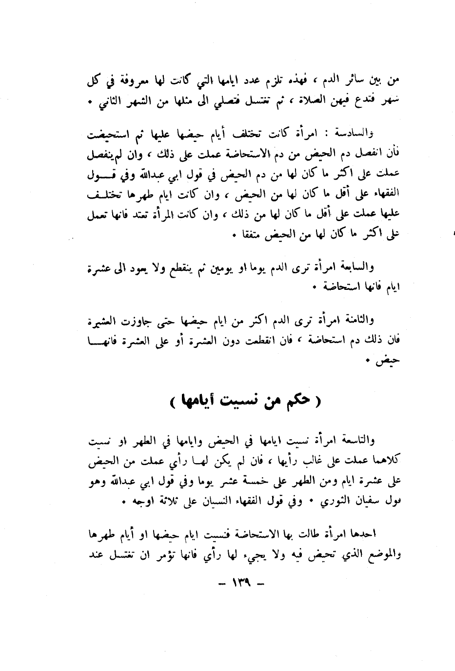 والتاسعة امْرَأَة نسيت ايامها فِي الْحيض وايامها فِي الطُّهْر اَوْ نسيت كِلَاهُمَا عملت على غَالب رأيها فان لم يكن لَهَا رَأْي عملت من الْحيض على عشرَة ايام وَمن الطُّهْر على خَمْسَة عشر يَوْمًا وَفِي قَول ابي عبد الله وَهُوَ قَول سُفْيَان الثَّوْريّ وَفِي قَول الْفُقَهَاء النسْيَان على ثَلَاثَة اوجه