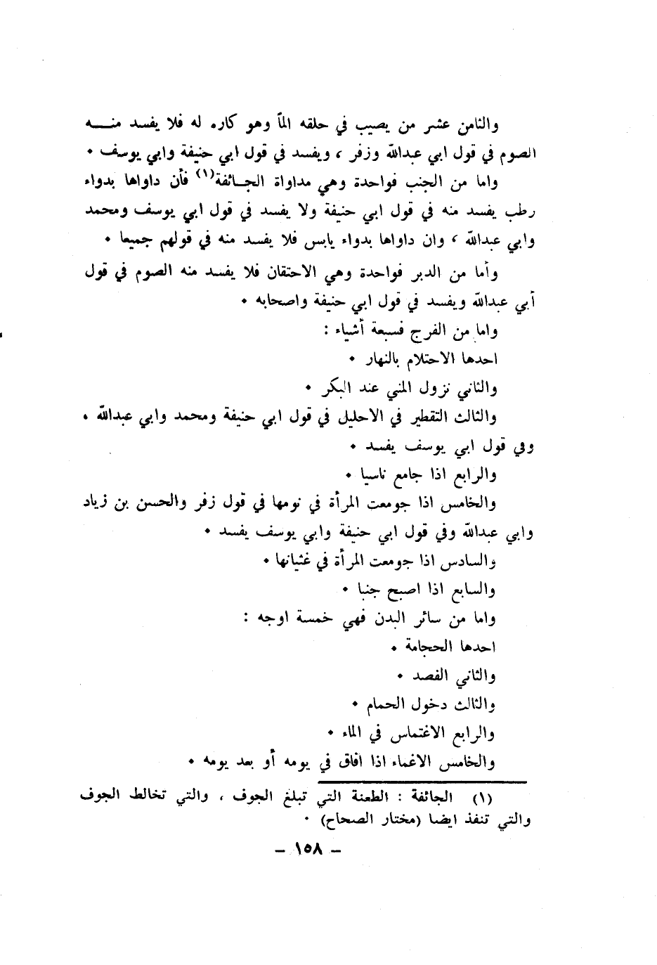 وَالثَّامِن عشر من يُصِيب فِي حلقه الما وَهُوَ كَارِه لَهُ فَلَا يفْسد مِنْهُ الصَّوْم فِي قَول ابي عبد الله وَزفر وَيفْسد فِي قَول ابي حنيفَة وابي يُوسُف
