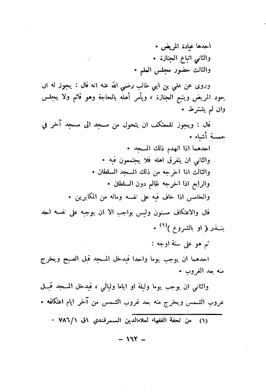 وروى عَن عَليّ بن ابي طَالب رَضِي الله عَنهُ انه قَالَ يجوز لَهُ ان يعود الْمَرِيض وَيتبع الْجِنَازَة وَيَأْمُر أَهله بِالْحَاجةِ وَهُوَ قَائِم وَلَا يجلس وان لم يشْتَرط
