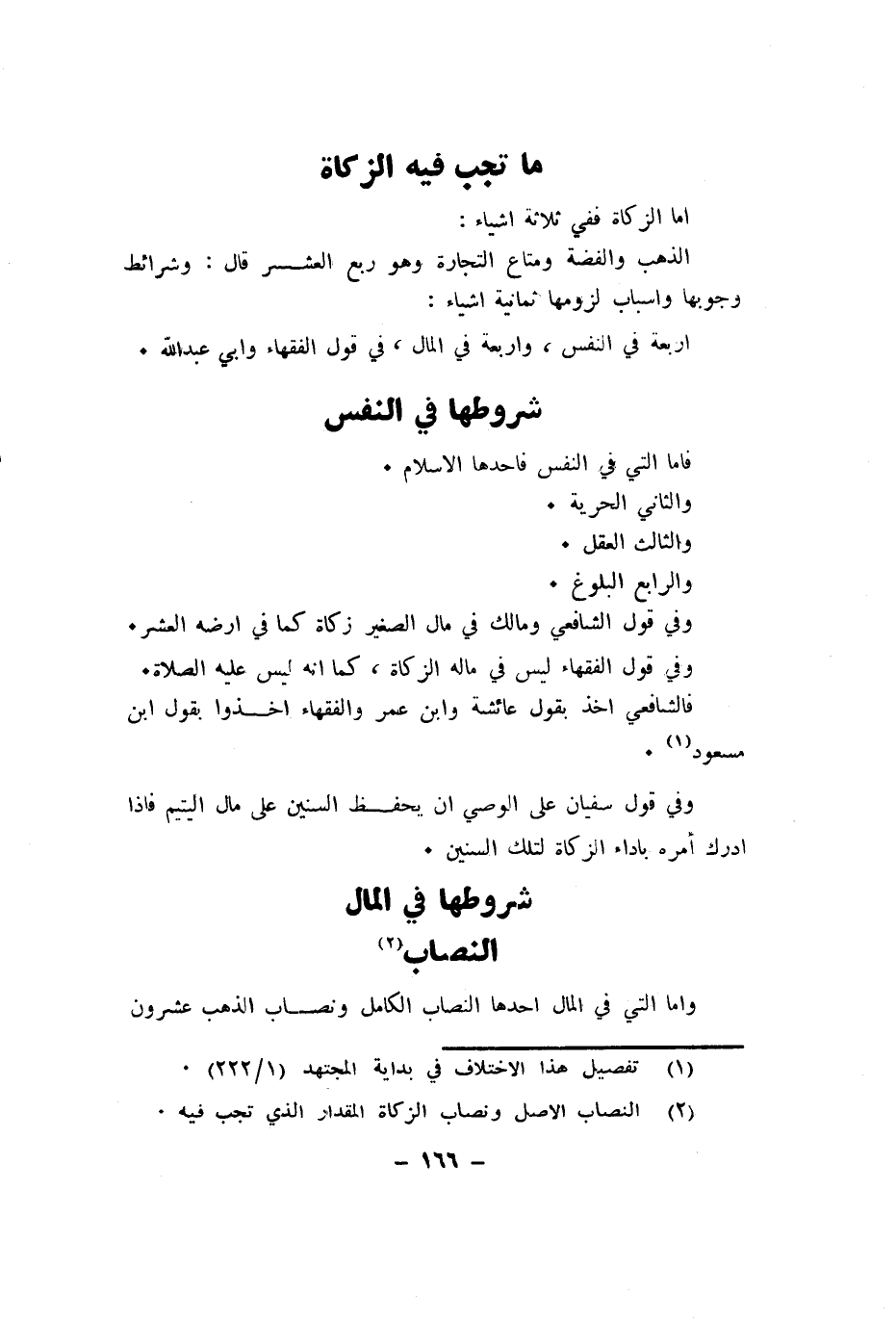 واما الَّتِي فِي المَال احدها النّصاب الْكَامِل ونصاب الذَّهَب عشرُون