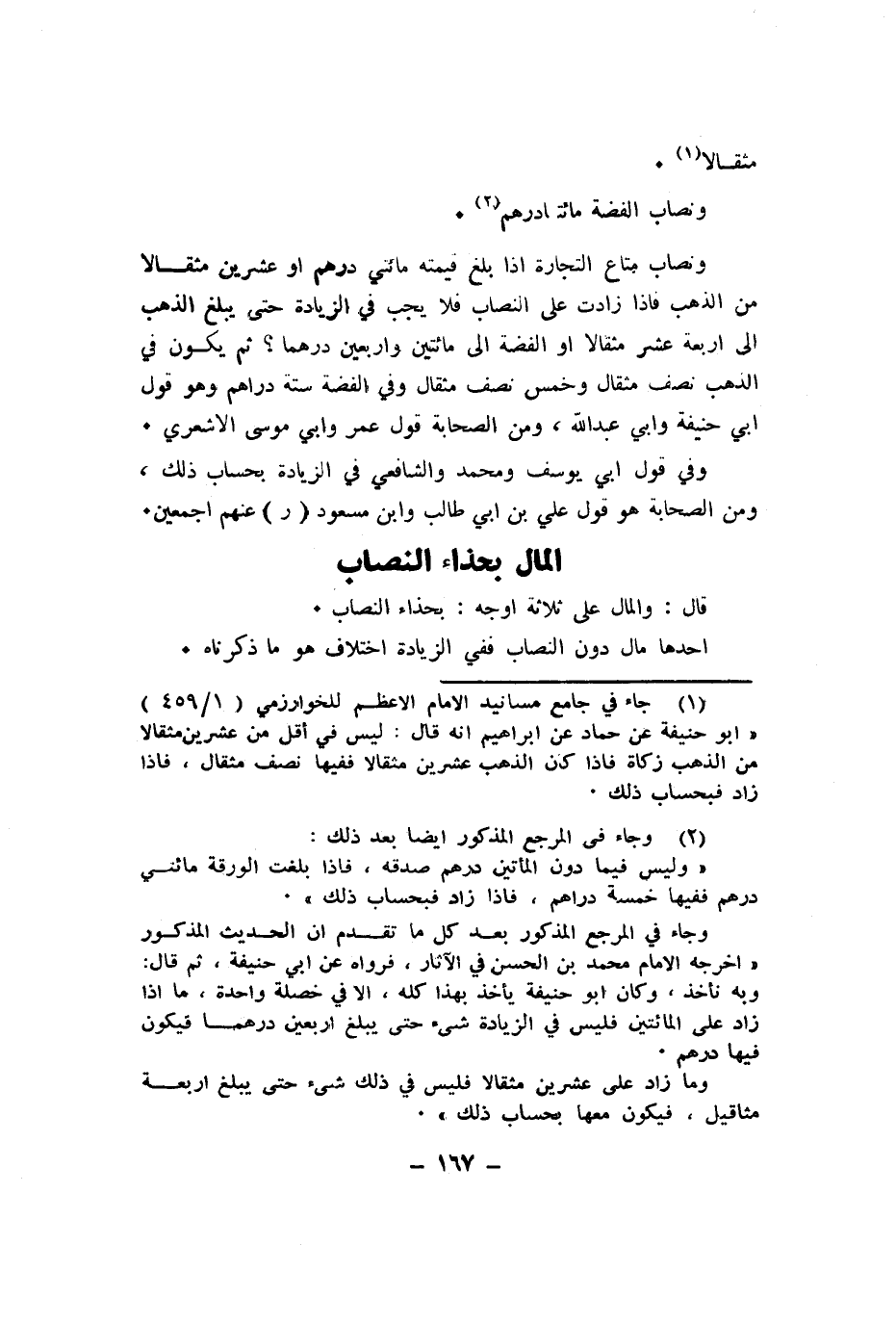 ونصاب مَتَاع التِّجَارَة اذا بلغ قِيمَته مِائَتي دِرْهَم اَوْ عشرُون مِثْقَالا من الذَّهَب فاذا زَادَت على النّصاب فَلَا يجب فِي الزِّيَادَة حَتَّى يبلغ الذَّهَب الى اربعة عشر مِثْقَالا أَو الْفضة إِلَى مِائَتَيْنِ وَأَرْبَعين درهما ثمَّ يكون فِي الذَّهَب نصف مِثْقَال وَخمْس نصف مِثْقَال وَفِي الْفضة سِتَّة دَرَاهِم وَهُوَ قَول ابي حنيفَة وابي عبد الله وَمن الصَّحَابَة قَول عمر وابي مُوسَى الاشعري