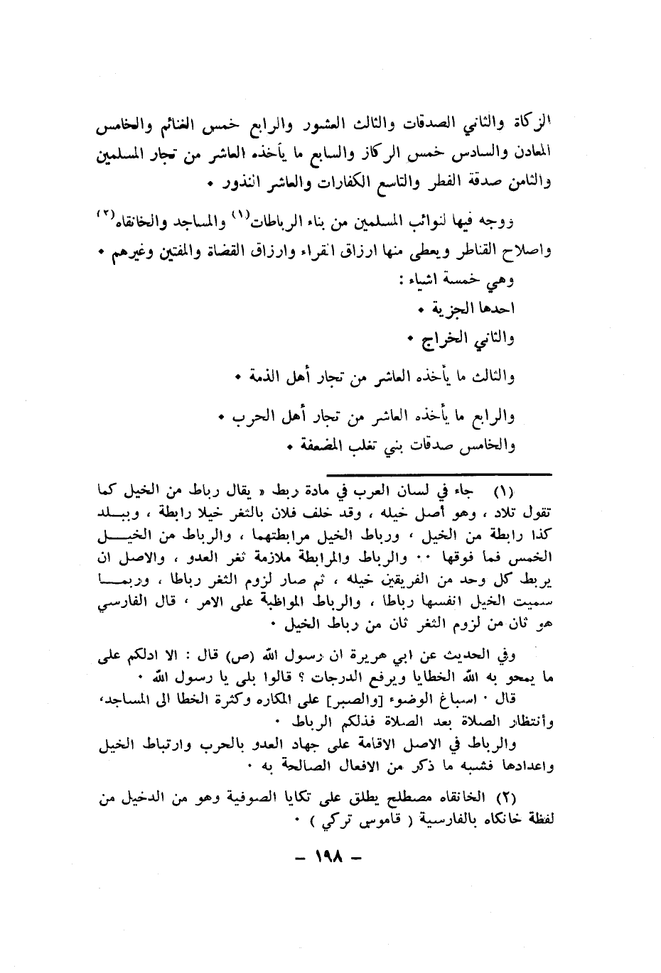وَوجه فِيهَا لنوائب الْمُسلمين من بِنَاء الرباطات والمساجد والخانقاه واصلاح القناطر وَيُعْطى مِنْهَا ارزاق الْقُرَّاء وارزاق الْقُضَاة والمفتين وَغَيرهم وَهِي خَمْسَة اشياء