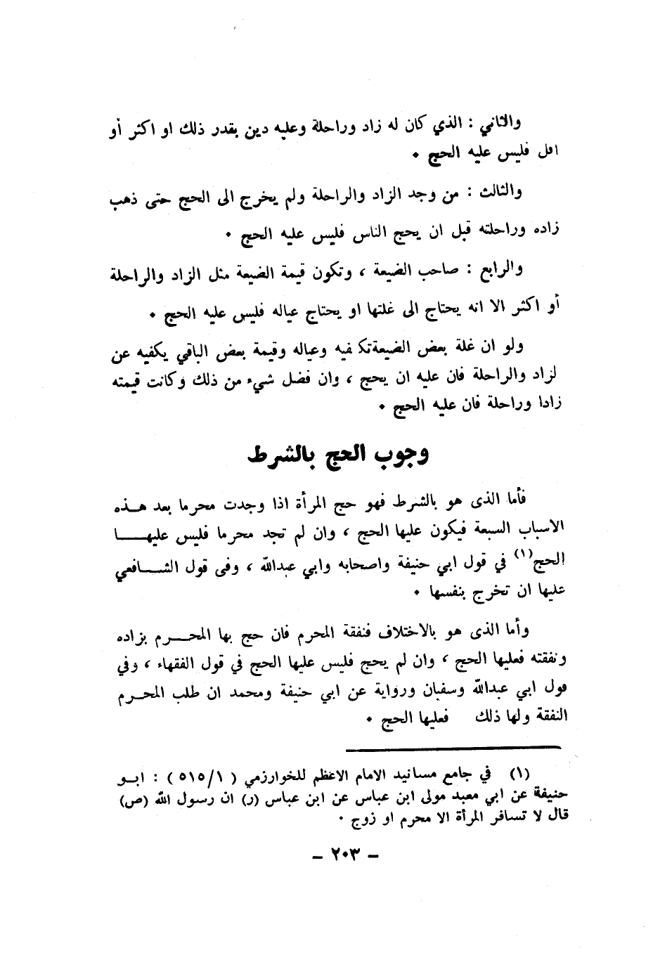 فَأَما الَّذِي هُوَ بِالشّرطِ فَهُوَ حج الْمَرْأَة اذا وجدت محرما بعد هَذِه الاسباب السَّبْعَة فَيكون عَلَيْهَا الْحَج وان لم تَجِد محرما فَلَيْسَ عَلَيْهَا الْحَج فِي قَول ابي حنيفَة واصحابه وابي عبد الله وَفِي قَول الشَّافِعِي عَلَيْهَا ان تخرج بِنَفسِهَا