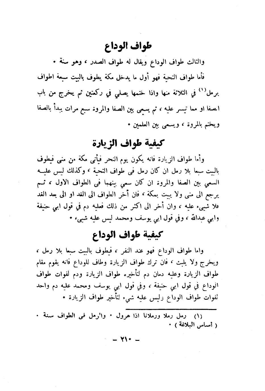 وَأما طواف الزِّيَارَة فانه يكون يَوْم النَّحْر فَيَأْتِي مَكَّة من منى فيطوف بِالْبَيْتِ سبعا بِلَا رمل ان كَانَ رمل فِي طواف التَّحِيَّة وَكَذَلِكَ لَيْسَ عَلَيْهِ السَّعْي بَين الصَّفَا والمروة ان كَانَ سعي بَينهمَا فِي الطّواف الاول ثمَّ يرجع الي منى وَلَا يبيت بِمَكَّة فان أخر الطّواف الي الْغَد اَوْ الى بعد الْغَد فَلَا شيئ عَلَيْهِ وان أخر الى اكثر من ذَلِك فَعَلَيهِ دم فِي قَول ابي حنيفَة وابي عبد الله وَفِي قَول ابي يُوسُف وَمُحَمّد لَيْسَ عَلَيْهِ شيئ