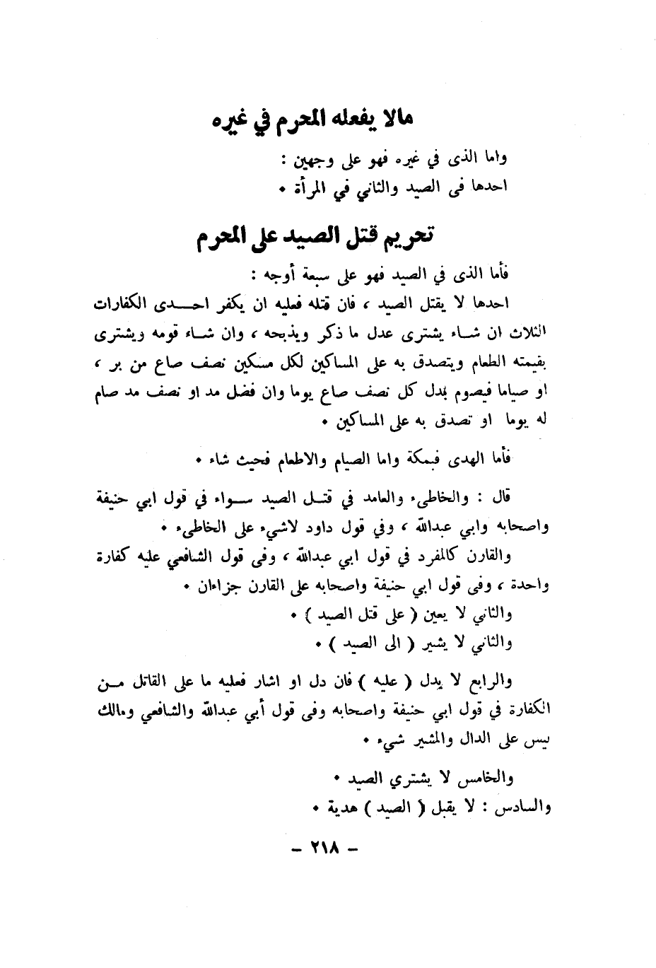 احدها لَا يقتل الصَّيْد فان قَتله فَعَلَيهِ ان يكفر احدى الْكَفَّارَات الثَّلَاث ان شَاءَ يشترى عدل مَا ذكر ويذبحه وان شَاءَ قومه وَيَشْتَرِي بِقِيمَتِه الطَّعَام وَيتَصَدَّق بِهِ على الْمَسَاكِين لكل مِسْكين نصف صَاع من بر اَوْ صياما فيصوم بدل كل نصف صَاع يَوْمًا وان فضل مد اَوْ نصف مد صَامَ لَهُ يَوْمًا اَوْ تصدق بِهِ على الْمَسَاكِين