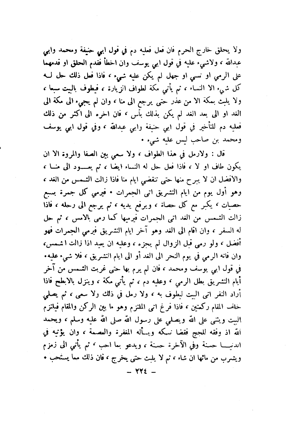 وَلَا يحلق خَارج الْحرم فان فعل فَعَلَيهِ دم فِي قَول ابي حنيفَة وَمُحَمّد وابي عبد الله وَلَا شَيْء عَلَيْهِ فِي قَول ابي يُوسُف وان اخطأ فَقدم الْحلق اَوْ قدمهما على الرَّمْي اَوْ نسي اَوْ جهل لم يكن عَلَيْهِ شَيْء فاذا فعل ذَلِك حل لَهُ كل شَيْء الا النِّسَاء ثمَّ يَأْتِي مَكَّة لطواف الزِّيَارَة فيطوف بِالْبَيْتِ سبعا وَلَا يلبث بِمَكَّة الا من عذر حَتَّى يرجع الى منا وان لم يَجِيء الى مَكَّة الى الْغَد اَوْ الى بعد الْغَد لم يكن بذلك بَأْس فان اخره الى اكثر من ذَلِك فَعَلَيهِ دم للتأخير فِي قَول أبي حنيفَة ابي عبد الله وَفِي قَول ابي يُوسُف وَمُحَمّد بن صَاحب لَيْسَ عَلَيْهِ شَيْء